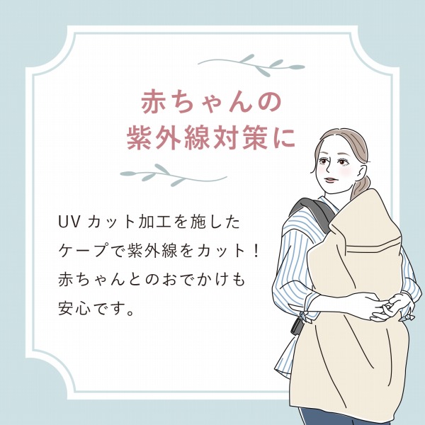 | UVカット加工を施したケープで紫外線をカット!赤ちゃんとのおでかけも安心です。日差しが気になるときにさっとかぶれるフード付き。抱っこひもだけでなくベビーカーなどにもクリップで簡単に取り付けできます。 |