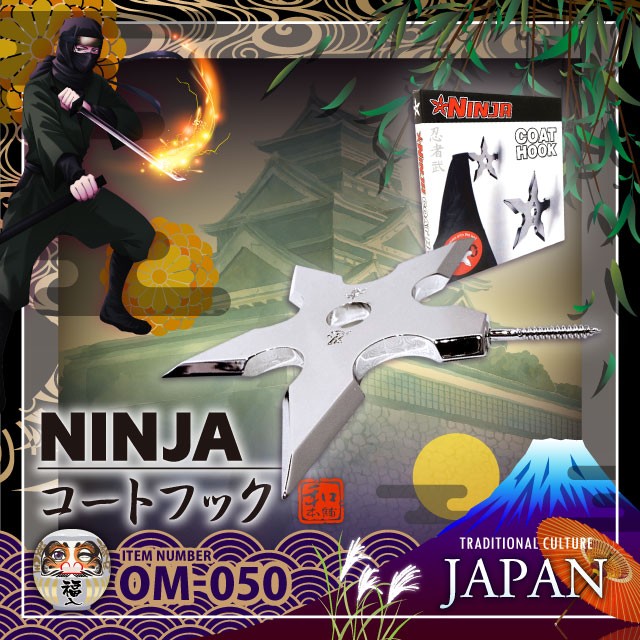 忍者の代表的な武器である手裏剣を、本当に壁に刺さっているかのようなトリッキーなコートフックにしました。