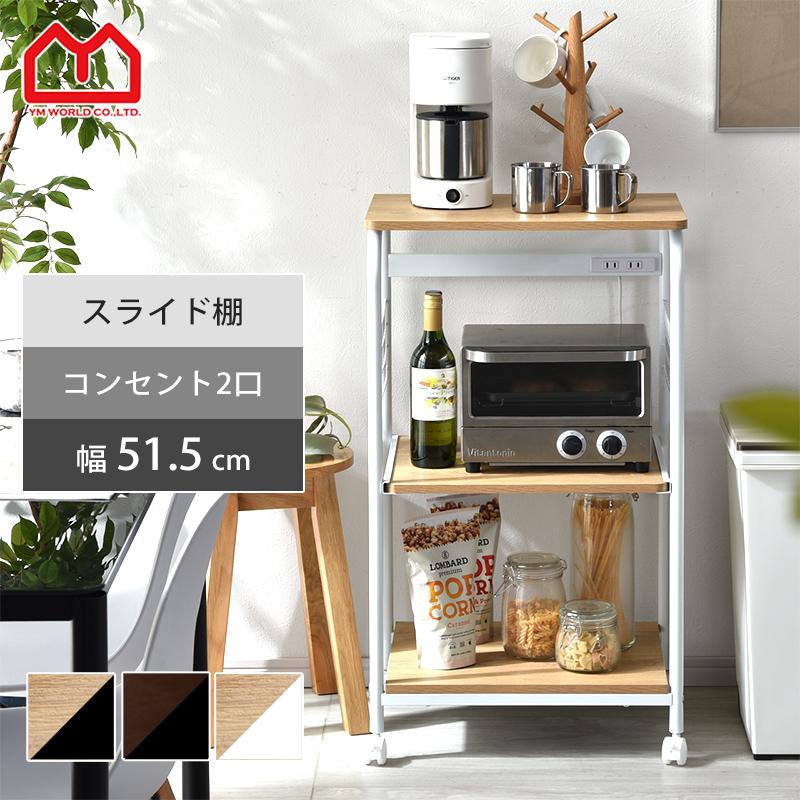 レンジ台 レンジラック 幅51 3段 キャスター付き スライド棚 コンセント付 おしゃれ 大型レンジ対応 コンパクト スリム キッチンラック ワゴン 台 レンジボード