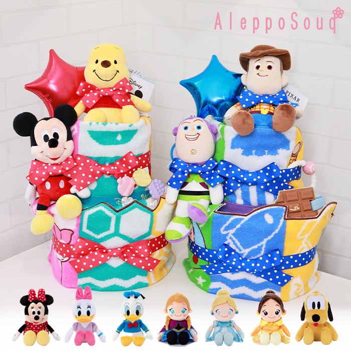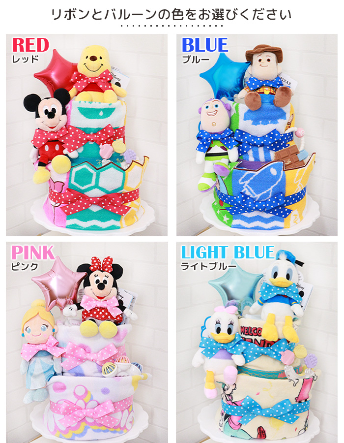 出産祝い おむつケーキ ディズニー レインボー2おむつケーキ 2段 ぬいぐるみ フェイスタオル 歯固め ラトル おもちゃ ベビートイ