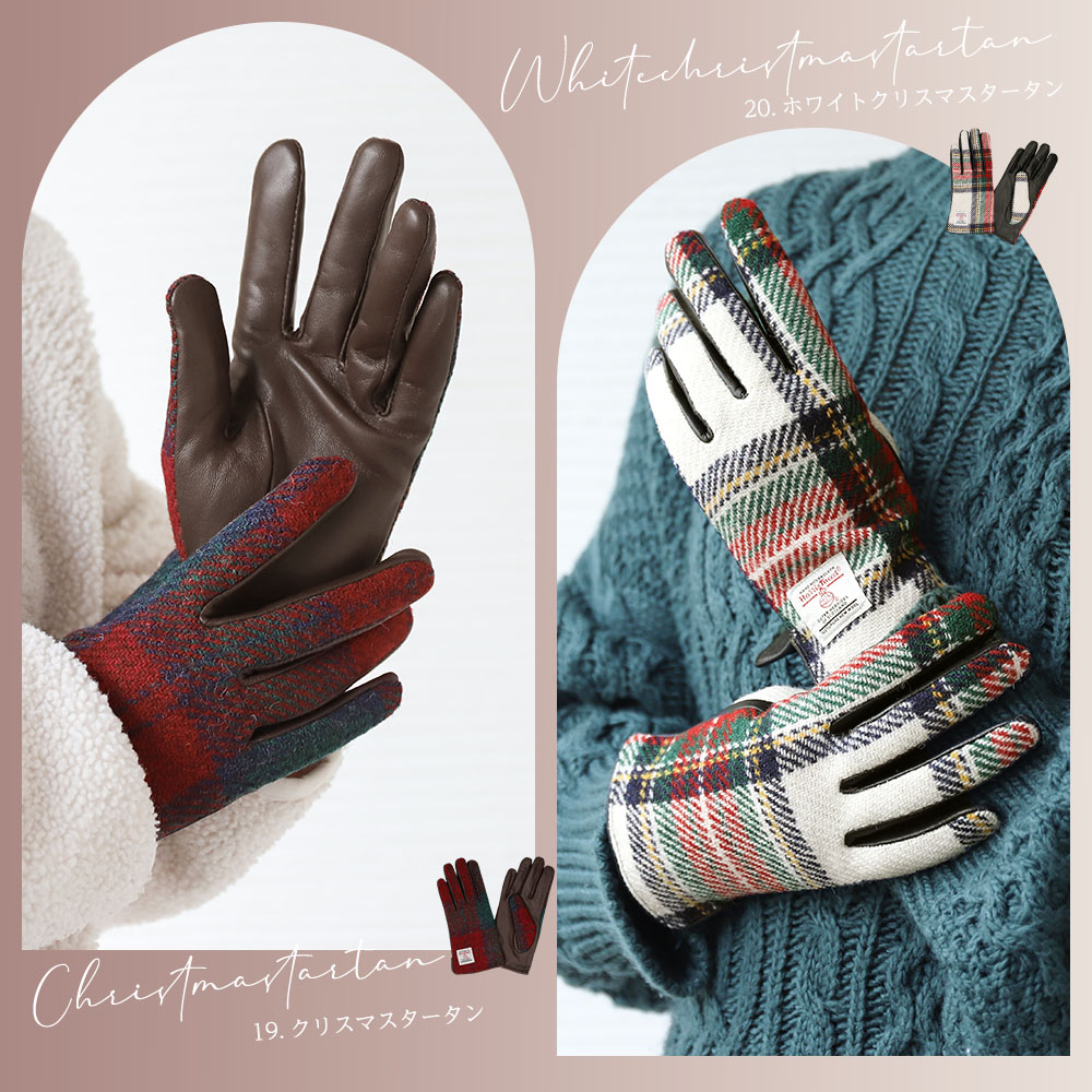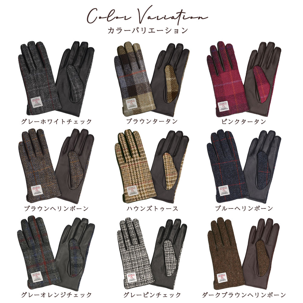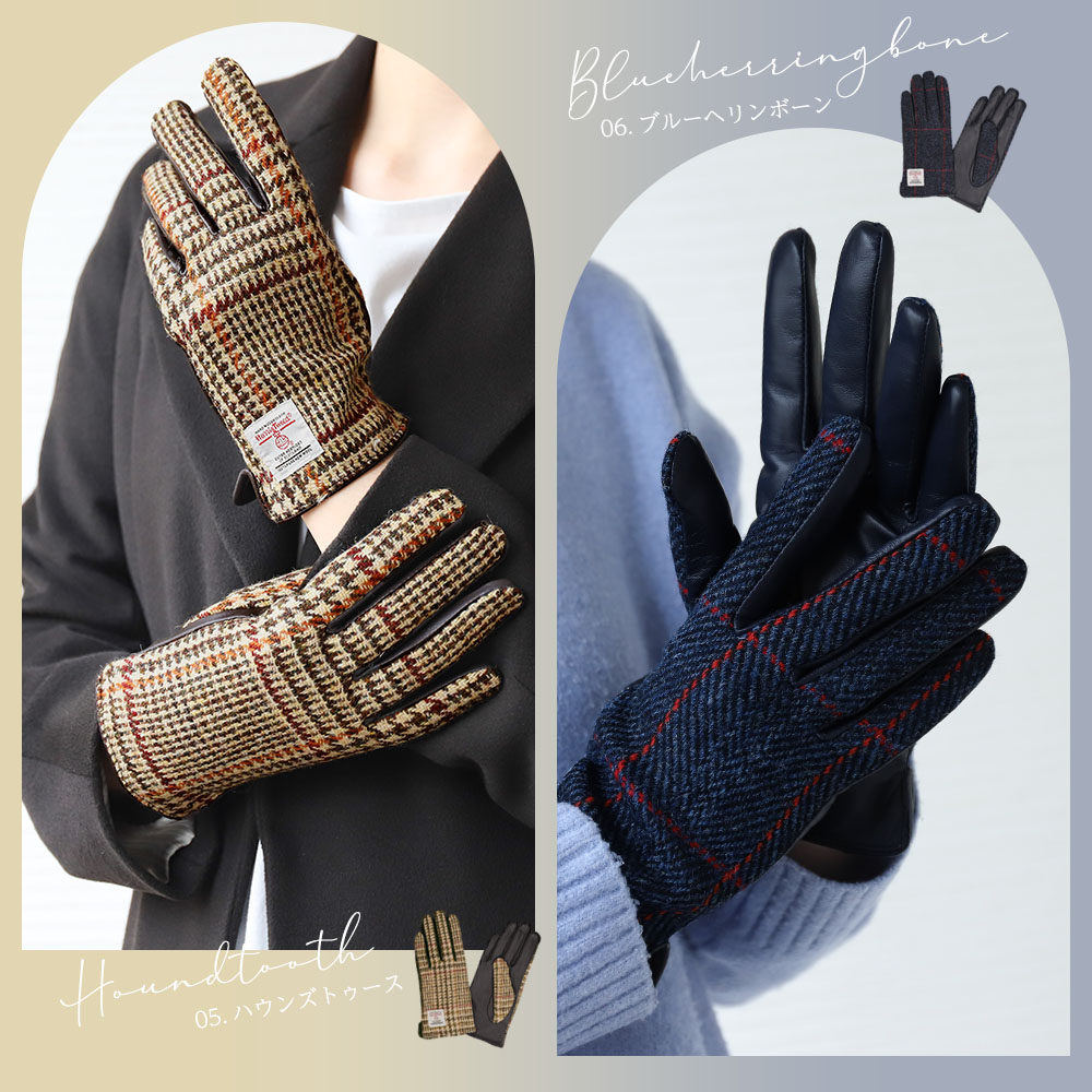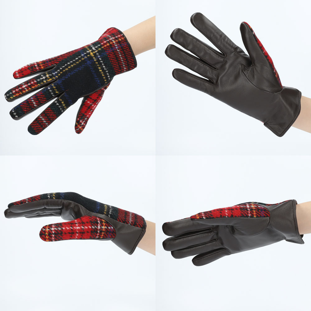 英国の伝統素材であるハリスツイードと、羊革の中でも一番柔らかくて上質なラムスキンを使用したレザーグローブです。両手の甲部分に取り付けられたオーブマーク付きのラベルは、手甲のハリス生地は本物のHarris Tweedの証。上質な素材と技術により、外観だけなく、肌触り、温かさも抜群の逸品です。レザーとツイード素材のコントラストの効いたデザインが手指を美しく見せてくれます。裏側全体には、毛足が長いベルベットを採用。ポリエステルベルベットは、コスメパフにも使われるくらい肌触りがとても柔らかく、手を温かく包み込んでくれます。タッチパネル操作が出来る様、革全体に加工を施しているので、寒い中でのスマホ操作、駅での券売機やATM操作時に手袋を外す必要がなく、利便性もあります。生産拠点の工場は、ヨーロッパのファッションシーンにもアイテムを提供しているので、手のラインを美しく魅せる技術、縫製に長けています。