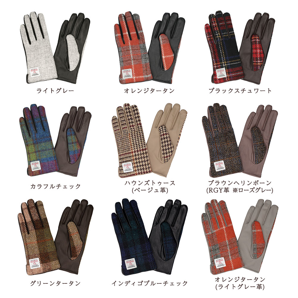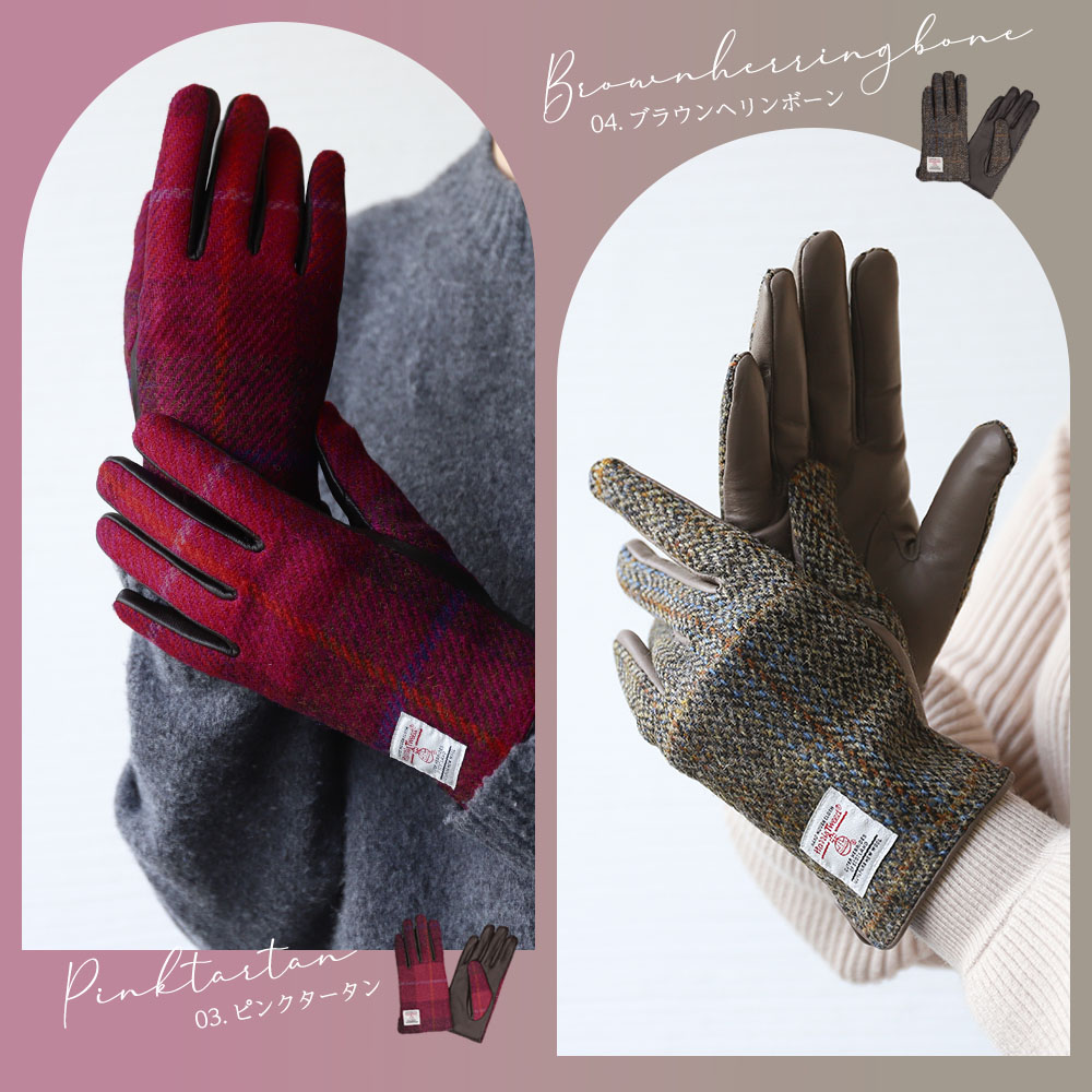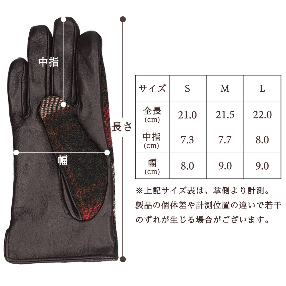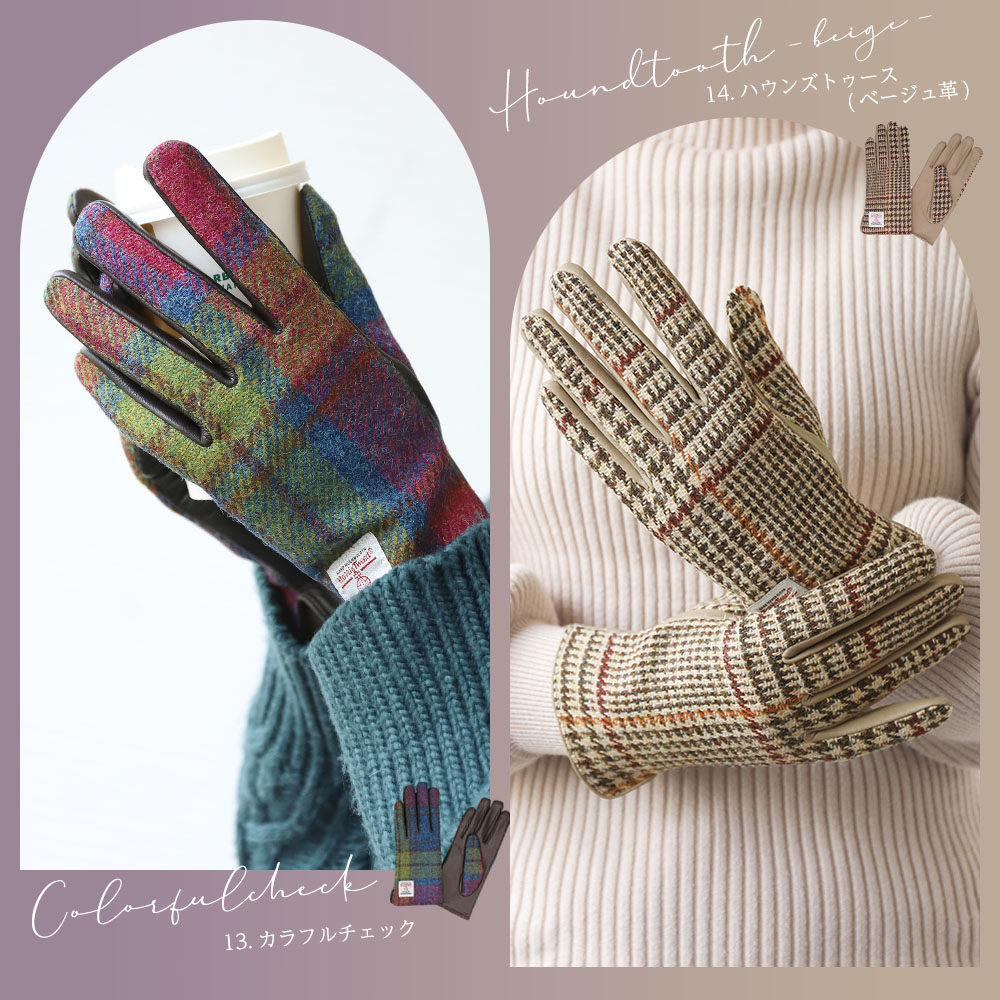 英国の伝統素材であるハリスツイードと、羊革の中でも一番柔らかくて上質なラムスキンを使用したレザーグローブです。両手の甲部分に取り付けられたオーブマーク付きのラベルは、手甲のハリス生地は本物のHarris Tweedの証。上質な素材と技術により、外観だけなく、肌触り、温かさも抜群の逸品です。レザーとツイード素材のコントラストの効いたデザインが手指を美しく見せてくれます。裏側全体には、毛足が長いベルベットを採用。ポリエステルベルベットは、コスメパフにも使われるくらい肌触りがとても柔らかく、手を温かく包み込んでくれます。タッチパネル操作が出来る様、革全体に加工を施しているので、寒い中でのスマホ操作、駅での券売機やATM操作時に手袋を外す必要がなく、利便性もあります。生産拠点の工場は、ヨーロッパのファッションシーンにもアイテムを提供しているので、手のラインを美しく魅せる技術、縫製に長けています。