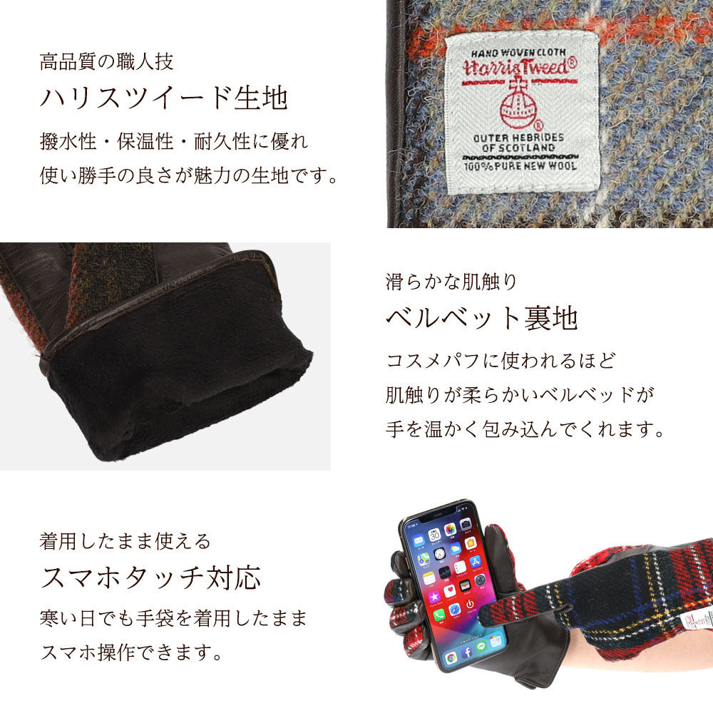 英国の伝統素材であるハリスツイードと、羊革の中でも一番柔らかくて上質なラムスキンを使用したレザーグローブです。両手の甲部分に取り付けられたオーブマーク付きのラベルは、手甲のハリス生地は本物のHarris Tweedの証。上質な素材と技術により、外観だけなく、肌触り、温かさも抜群の逸品です。レザーとツイード素材のコントラストの効いたデザインが手指を美しく見せてくれます。裏側全体には、毛足が長いベルベットを採用。ポリエステルベルベットは、コスメパフにも使われるくらい肌触りがとても柔らかく、手を温かく包み込んでくれます。タッチパネル操作が出来る様、革全体に加工を施しているので、寒い中でのスマホ操作、駅での券売機やATM操作時に手袋を外す必要がなく、利便性もあります。生産拠点の工場は、ヨーロッパのファッションシーンにもアイテムを提供しているので、手のラインを美しく魅せる技術、しっかりとした縫製に長けています。