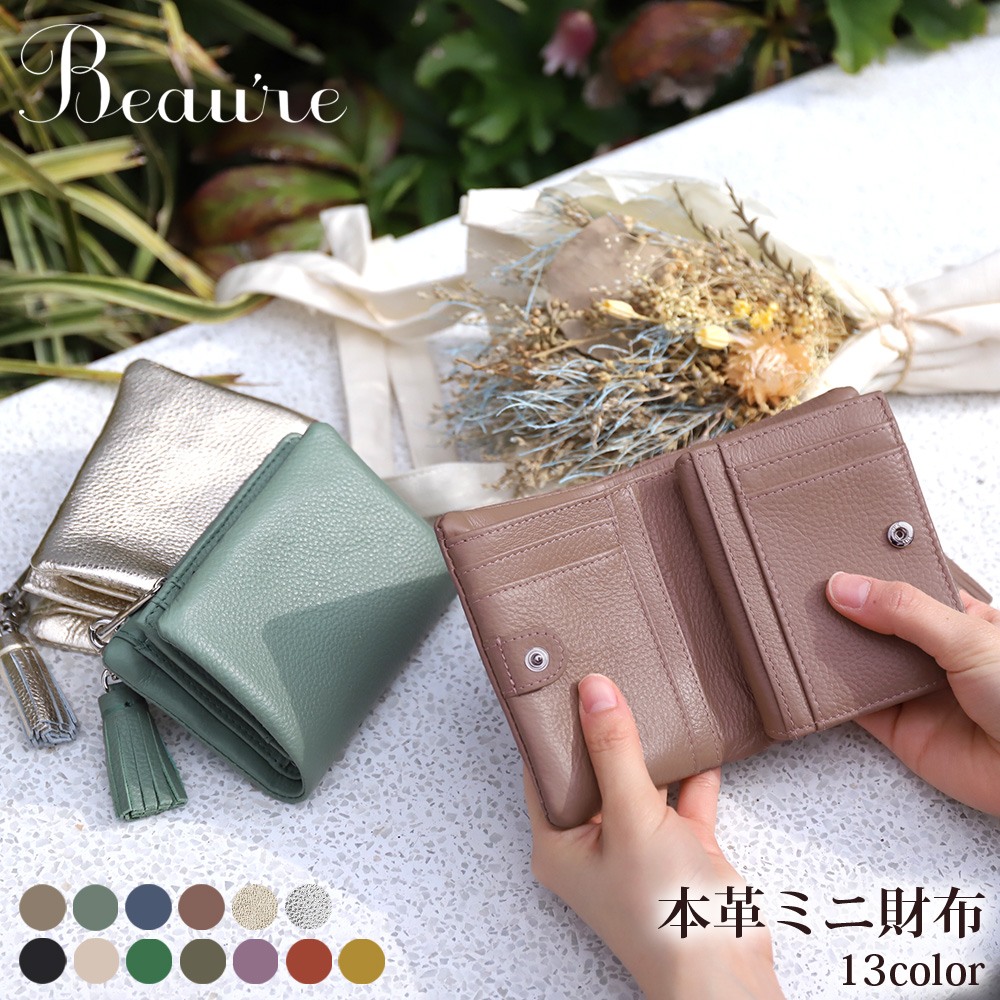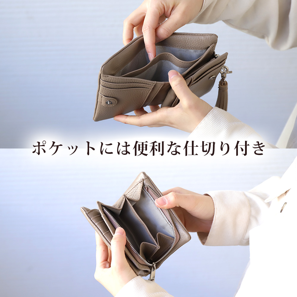上質な本牛革を使用した、ベーシックな二つ折り財布。コインケースは、パッと見やすいBOX型。カード入れは8枚、紙幣入れは2つに分かれている為、整理がしやすく機能的。紙幣入れの手前部分には、縦型にカードが入るカードホルダーが左右1カ所ずつ付いています。取り外しが出来るタッセルチャームもポイントになっています。柔らかで手に馴染む上質なレザーを使用しているので、使うたびに味わい深い表情をお楽しみ頂けます。キャッシュレス時代に合ったコンパクト財布は、ギフトにもオススメです。カラーバリエーションが豊富で春財布にもぴったり。母の日用のギフトとしても最適です。