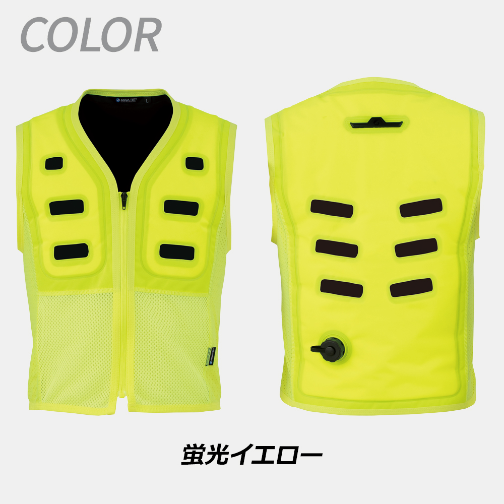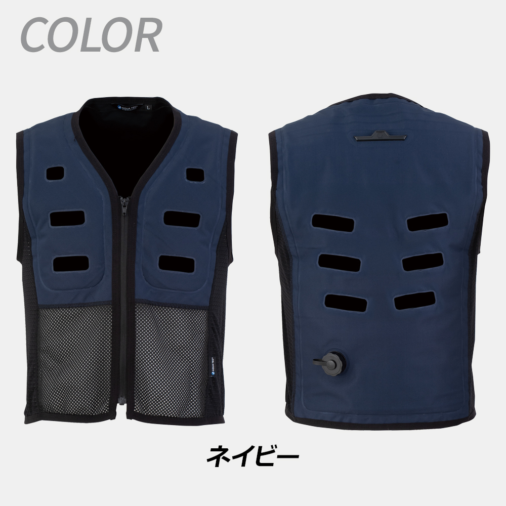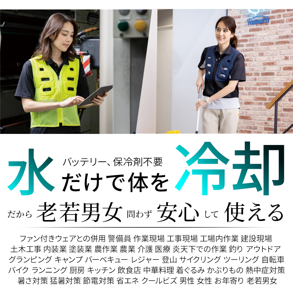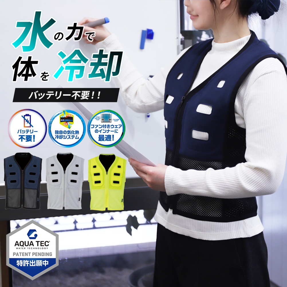 バッテリー、保冷剤不要!水だけの力で体を冷却するから老若男女問わず安心して使える!今話題の熱中症対策アイテム「アクアウォーターベスト」です。特許出願中の独自の気化熱冷却システムで水だけで長時間冷感が持続します。両サイドストレッチメッシュ素材でストレスフリーで着用でき、静電気除去テープ付で空調ファン付きウェアのインナーとして最適です。新デザインの大型通気口で蒸れを軽減しスリークォーターズ仕様で腹部は冷やさずにさらに軽量化を実現しました。ファン付きウェアとの併用 警備員 作業現場 工事現場 工場内作業 建設現場 土木工事 内装業 塗装業 農作業 農業 介護 医療 炎天下での作業 釣り アウトドア グランピング キャンプ バーベキュー レジャー 登山 サイクリング ツーリング 自転車 バイク ランニング 厨房 キッチン 飲食店 中華料理 着ぐるみ かぶりもの 熱中症対策暑さ対策 猛暑対策 節電対策 省エネ クールビズなど様々な用途、シーンでご使用いただけます。 爆買