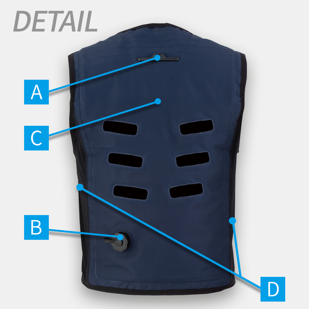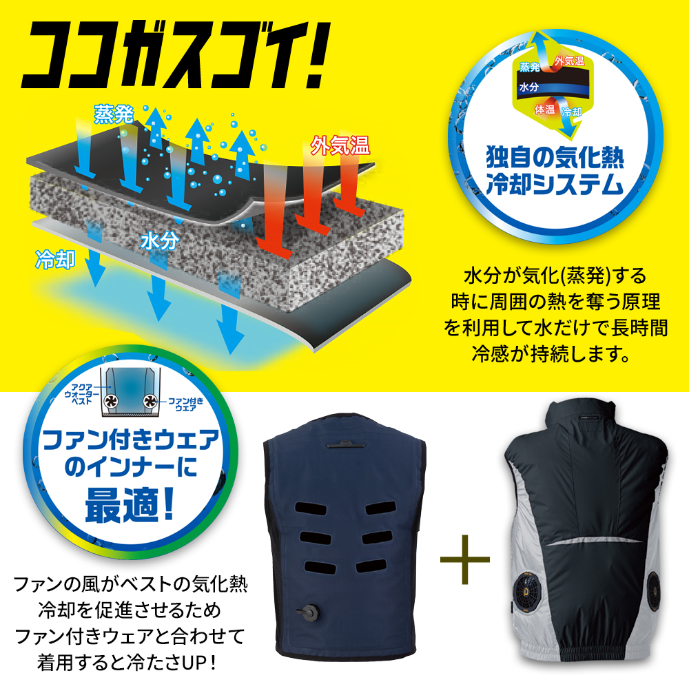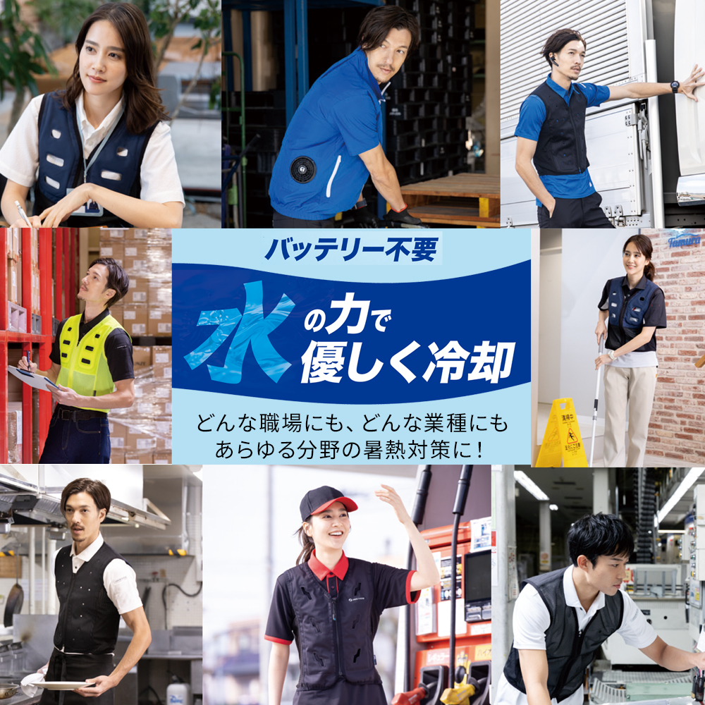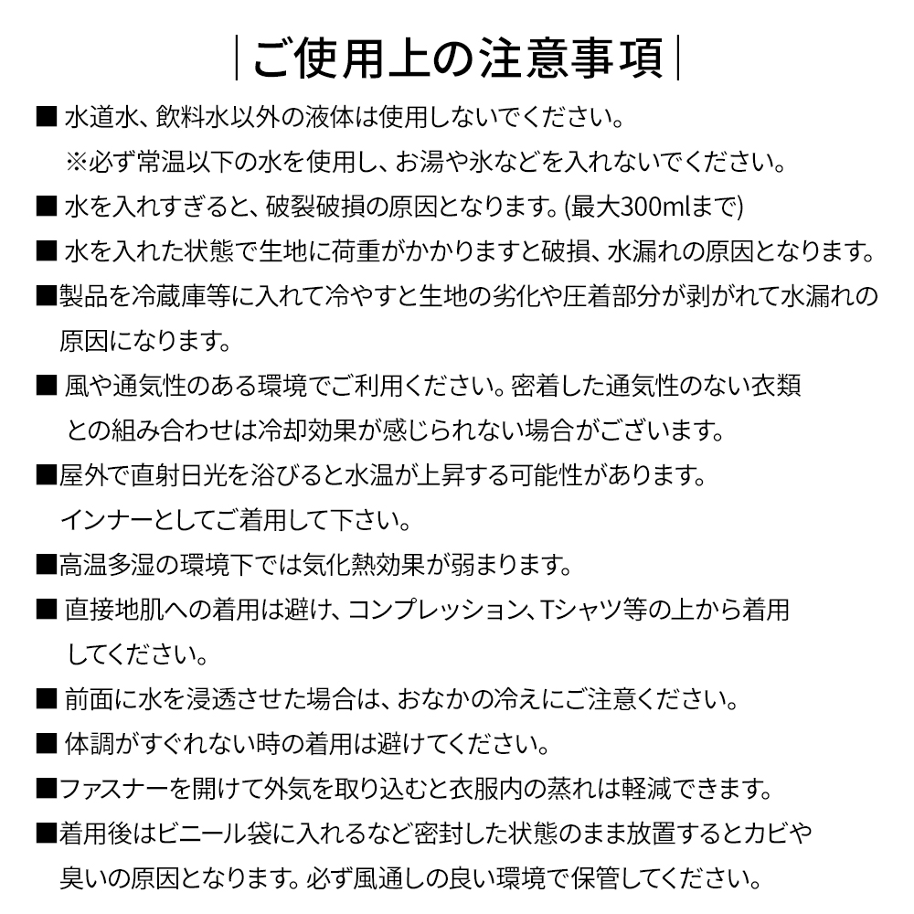 バッテリー、保冷剤不要!水だけの力で体を冷却するから老若男女問わず安心して使える!今話題の熱中症対策アイテム「アクアウォーターベスト」です。特許出願中の独自の気化熱冷却システムで水だけで長時間冷感が持続します。両サイドストレッチメッシュ素材でストレスフリーで着用でき、静電気除去テープ付で空調ファン付きウェアのインナーとして最適です。新デザインの大型通気口で蒸れを軽減しスリークォーターズ仕様で腹部は冷やさずにさらに軽量化を実現しました。ファン付きウェアとの併用 警備員 作業現場 工事現場 工場内作業 建設現場 土木工事 内装業 塗装業 農作業 農業 介護 医療 炎天下での作業 釣り アウトドア グランピング キャンプ バーベキュー レジャー 登山 サイクリング ツーリング 自転車 バイク ランニング 厨房 キッチン 飲食店 中華料理 着ぐるみ かぶりもの 熱中症対策暑さ対策 猛暑対策 節電対策 省エネ クールビズなど様々な用途、シーンでご使用いただけます。 爆買