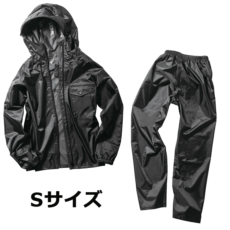 回転フード レインコート ブラック×ブラック Sサイズ 上下セット 耐水圧10000mmH2O メンズ レディース 兼用 オールシーズン