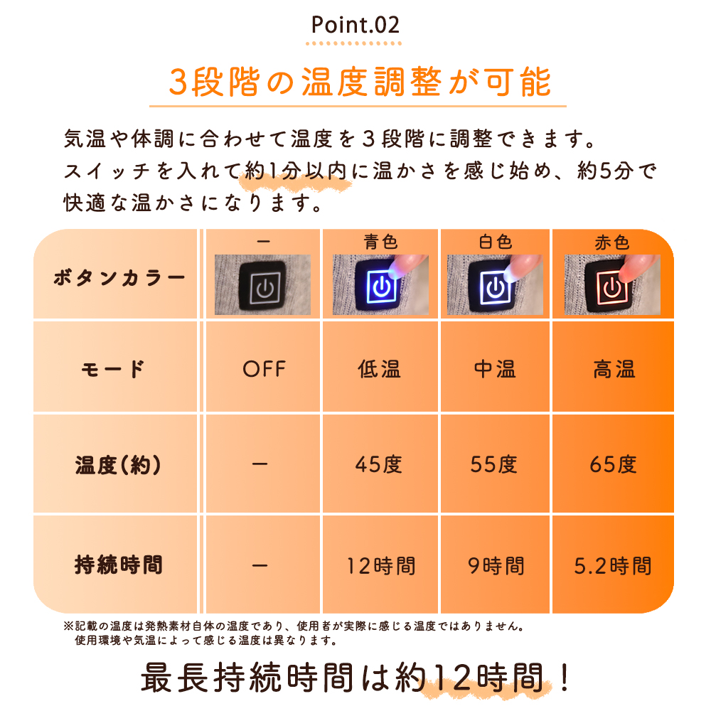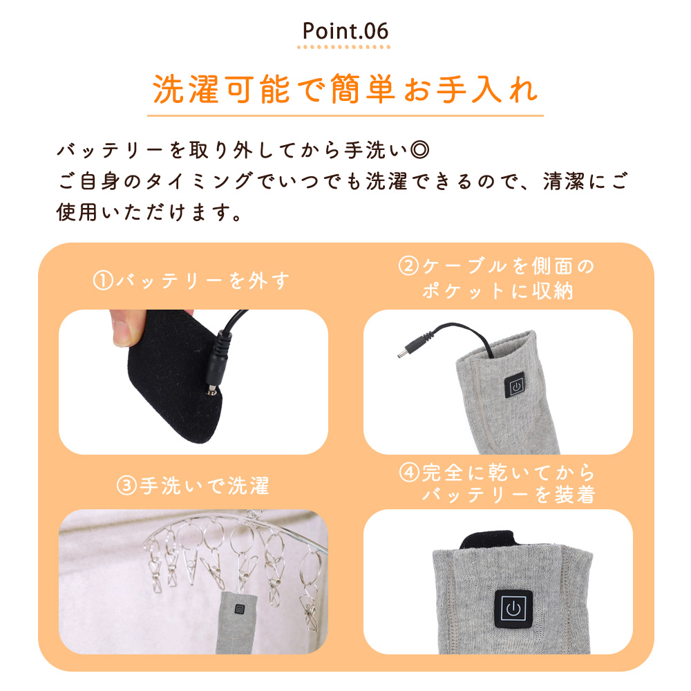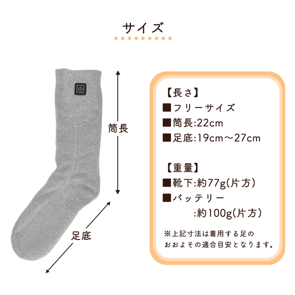 寒い日の屋外に限らず屋内でも。あらゆる場面で活躍する電熱ソックスです!冬のプレゼントに喜ばれること間違いなし♪ポイントは6つ!?足裏全体(かかと部分を除く)に加熱シートが内蔵されており、足裏全体から全身をほかほかとしたあたたかさで包み込みます。(2)気温や体調に合わせて温度を3段階(高温65度/中温55度/低温45度)に調整できます。スイッチを入れて約1分以内に温かさを感じ始め、約5分で快適な温かさになります。最長持続時間は8時間!?フリーサイズ(対象:約19〜27cm)で幅広く対応しており、窮屈すぎないピッタリ感なので「バッテリーがずれ落ちる...」といったストレスはありません。(4)男女ともに・場面を選ばずにご使用いただけるシンプルな無地デザインです。靴下自体がしっかりしており、長すぎず短すぎない丈感で様々なシーンでご使用いただけます。(5)バッテリーの検査は全品日本国内で行っており、電気用品安全法の厳しい検査に通過し安全基準を満たした認証(PSE)を取得しています。バッテリーは充電式で約4.5時間のフル充電で最長8時間の使用できます。(6)バッテリーを取り外し洗濯できるので、いつでも清潔にご使用いただけます。