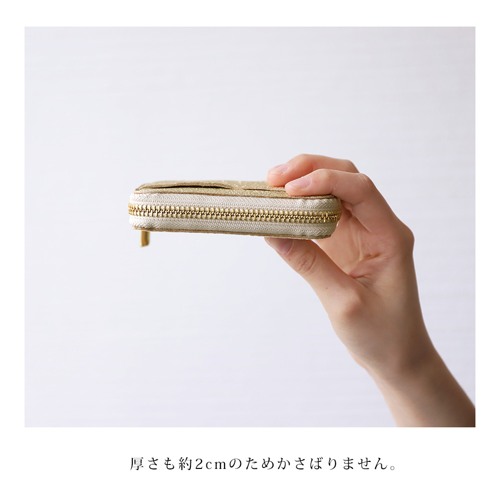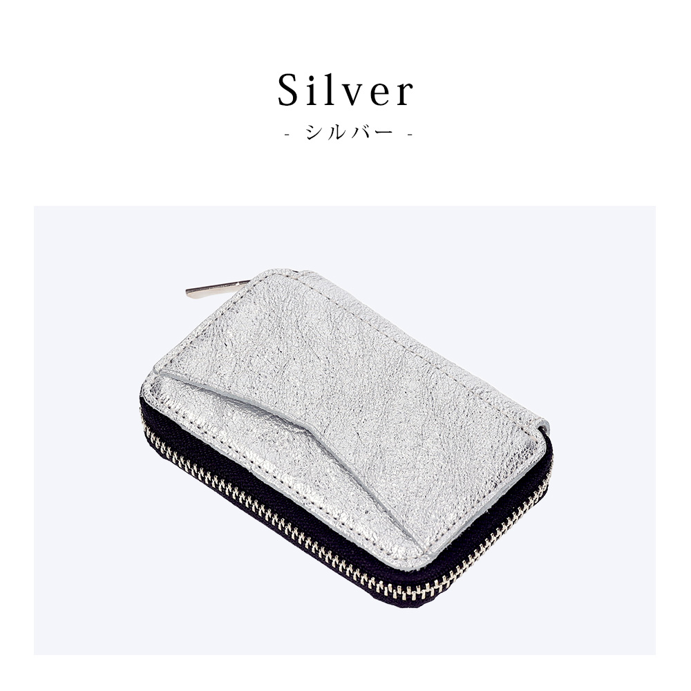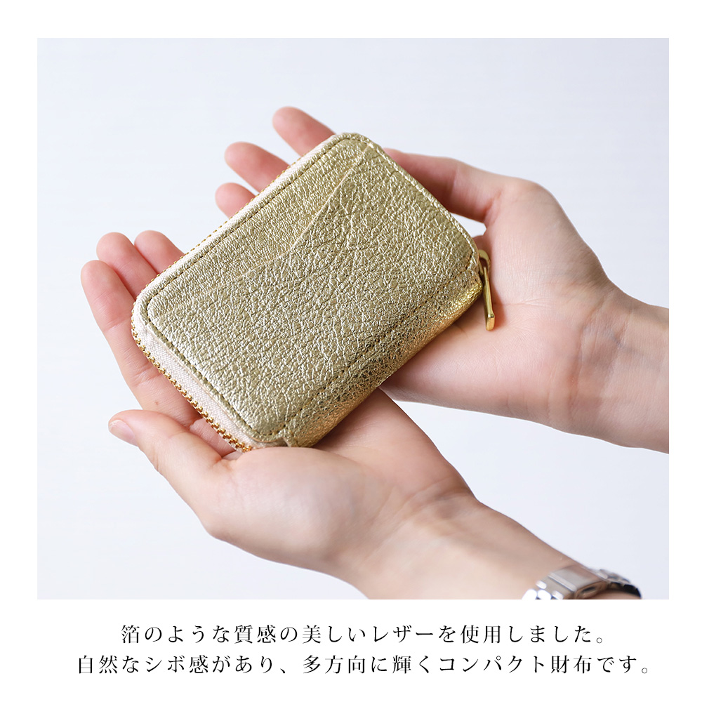 mu(ムー)「予定無し、コンセプト無し、刺激的な素材に出会えた時に自由な発想で物造りをしたい。」という思いから生まれたブランドです。箔のような質感の美しいレザーを使用しました。自然なシボ感があり、多方向に輝くコンパクト財布です。お札を折りたたまずに収納可能。おしゃれなロゴがワンポイントです。内側の両サイドについているフリーポケットには小銭やカードを収納可能。フリーポケットに小銭を入れた際に、小銭が飛び出さない設計になっています。外側のポケットはICカード等を収納可能。持ち歩きしやすいコンパクトサイズで、厚さも約2cmのためかさばりません。ゴールドとシルバーの色は、風水的にもとてもポジティブな意味をもつカラーです。手にフィットするサイズ感やいつでも持ちたくなるような使いやすさを意識しながらこだわって作られたシリーズです。