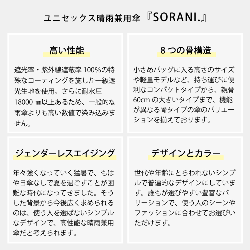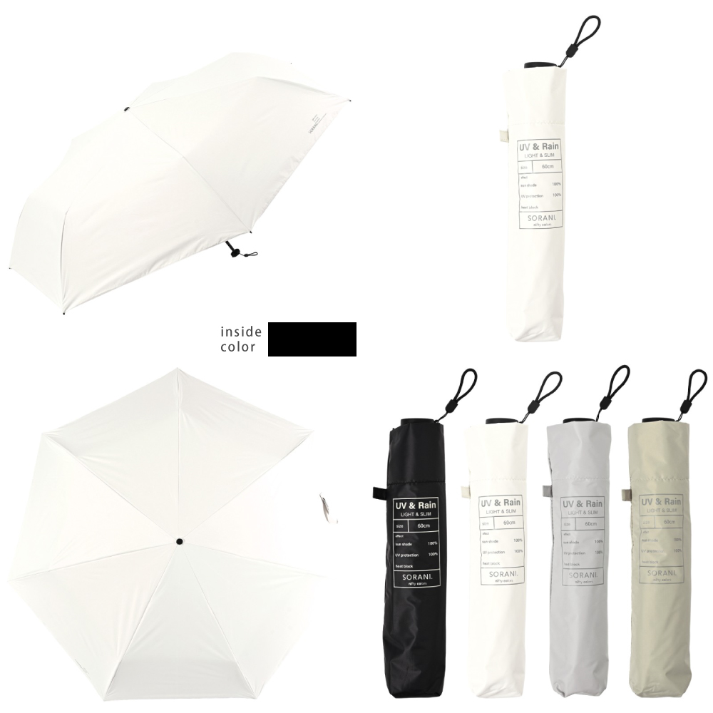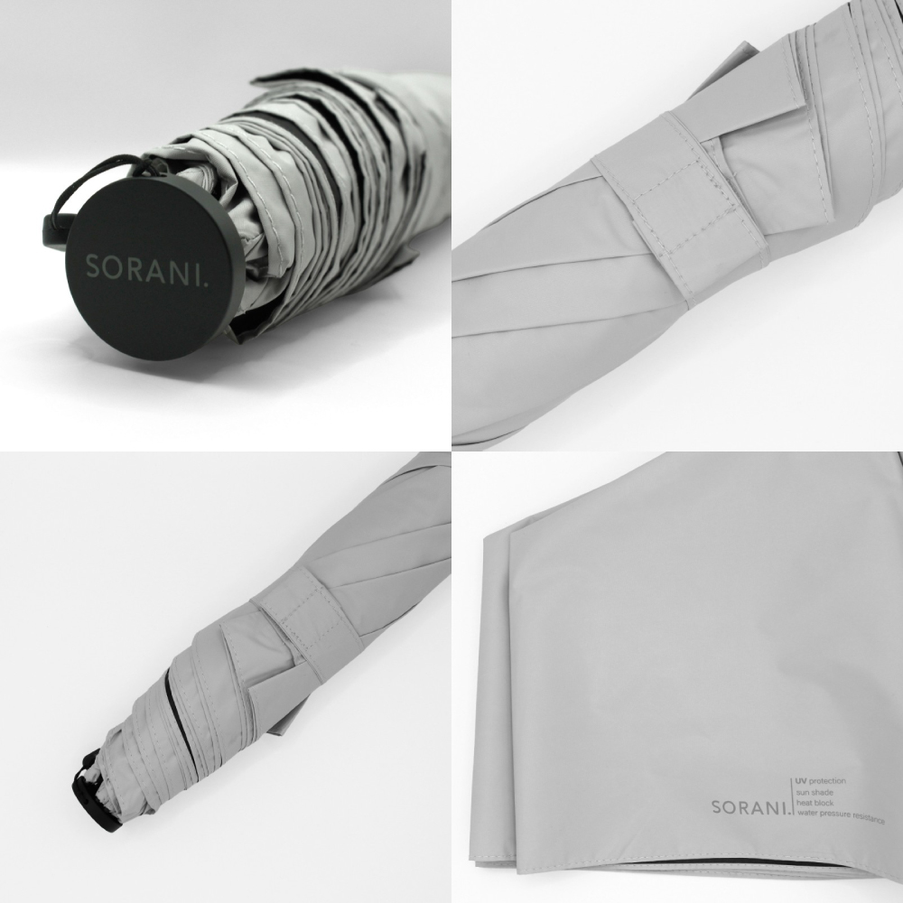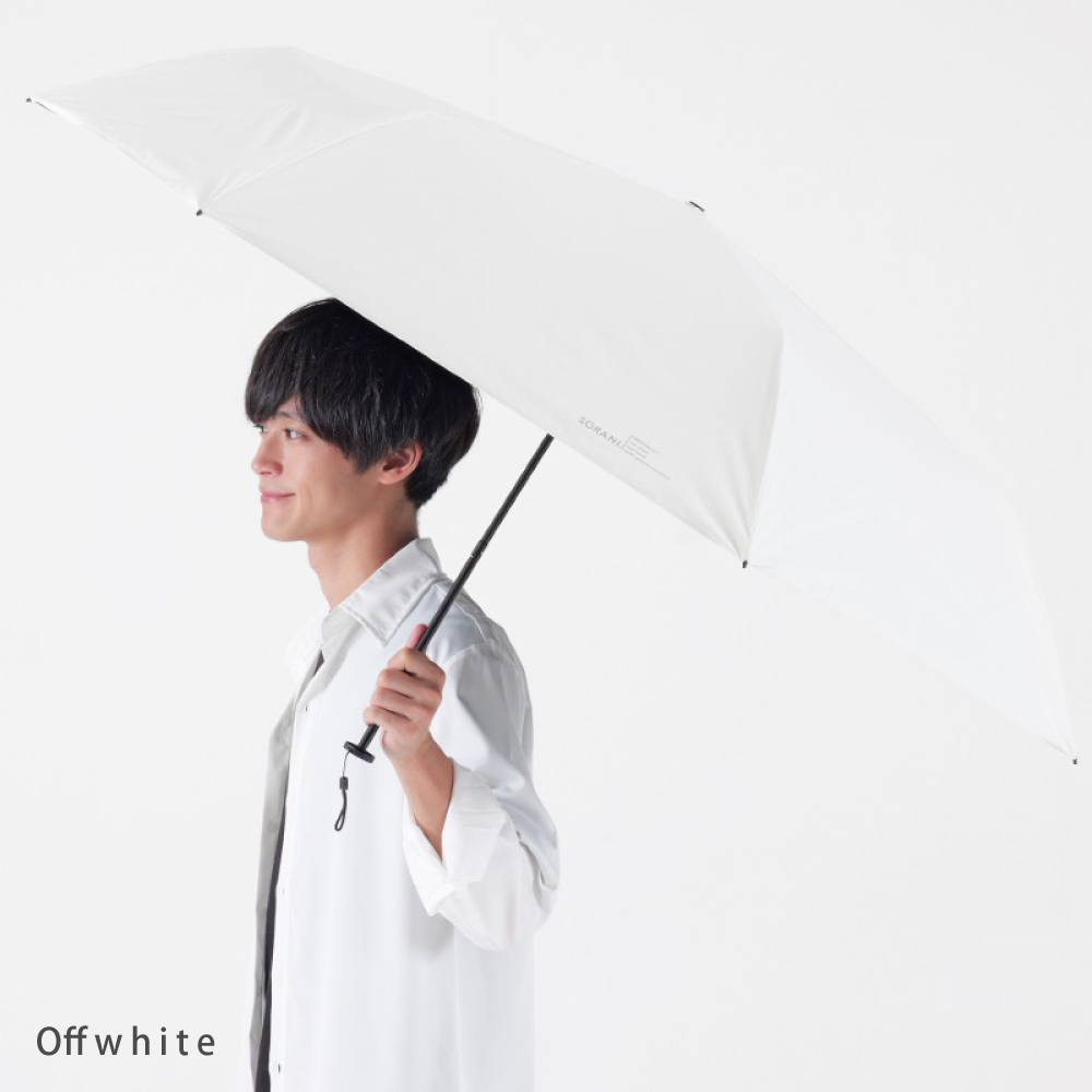 親骨にカーボンを使用した親骨60cmの軽量遮光晴雨兼用折りたたみ傘です。紫外線遮蔽率100%、UPF50+、遮光率100%、遮熱性効果のある一級遮光生地で強い日差しや暑さをしっかり遮ります。さらに、肌の深部に影響を与える近赤外線も100%遮断します。はっ水・防水機能を備え、耐水圧18,000mm以上を実測。薄く軽量な30デニール生地を採用しているので軽くコンパクトに収納可能です。親骨は通常より1本多い7本骨なので持った時に安定感があります。男性はもちろん大きめのサイズが欲しい女性の方にもおすすめです。さらに、指や爪を挟みにくい「安全ろくろ(ストッパー)」仕様で、ボタン操作もスムーズです。無駄のないシンプルな無地のデザインで、どんなスタイルにも合わせやすい大きめサイズの晴雨兼用日傘です。ベーシックなカラーリングなので男女兼用でお使いいただけます。手元やストラップはブラックで統一し、クールな印象に。裏面はブラックのポリウレタン加工を施しており、光をしっかり吸収して心地よい日陰を作ります。強い日差しの下でも快適にお使いいただけます。