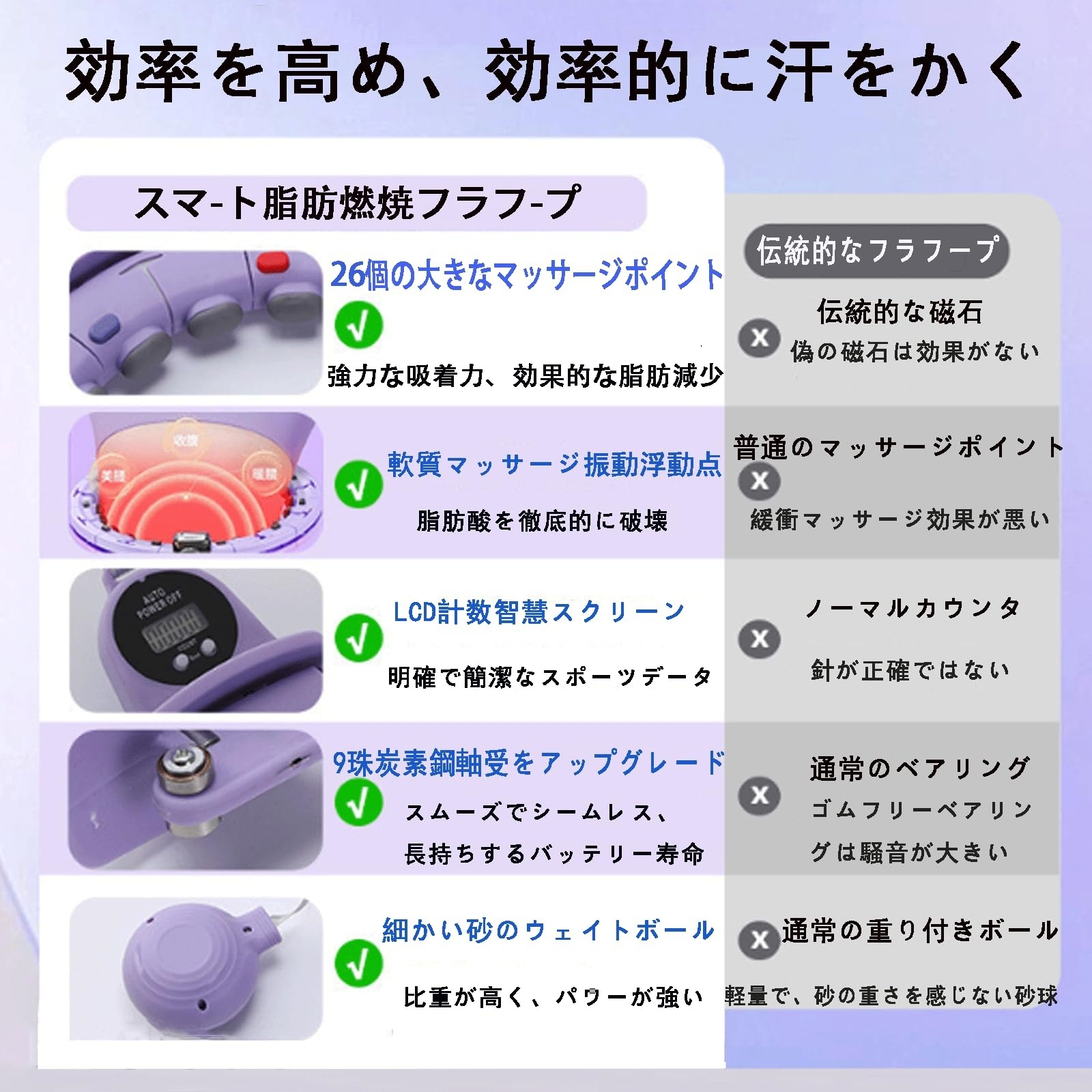 従来のフラフープの回転方法を見直したスマート設計で、ウエストにしっかりフィット。運動中でもずれにくく、初心者でも安心してお使いいただけます。環境配慮型のPP+ABS樹脂を使用し、耐久性と安全性にも優れています。