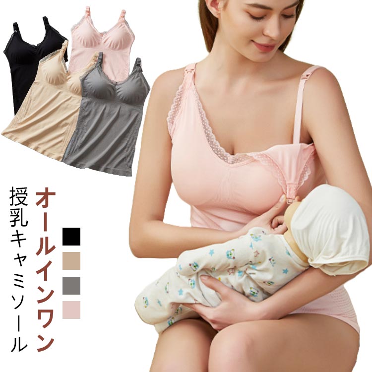 ブラカップ付き マタニティキャミ 2枚セット フロントオープン マタニティ 授乳キャミソール シームレス レース 可愛い 妊婦 授乳ブラ 授乳服 お腹