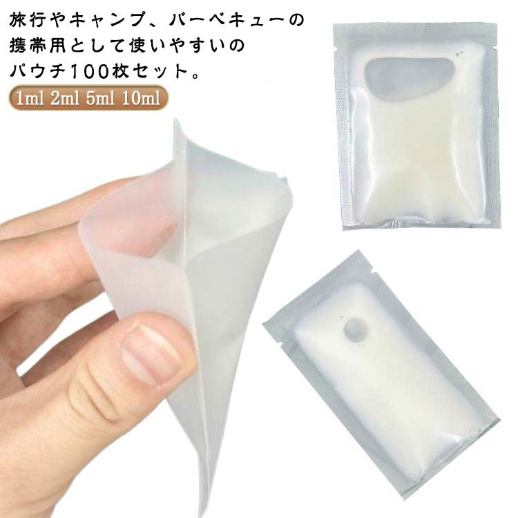 | 旅行やキャンプ、バーベキューの携帯用として使いやすいのパウチ100枚セット。 1ml 2ml 5ml 10mlの4サイズ展開、透明なので残量がひと目でわかります。 大きな注ぎ口で直接液体を注入でき、詰め替え・洗浄がしやすくなっています。 気密性の良いスクリューシールで、ヘアアイロンなどで密封されていて持ち運びも安心。 旅行用シャンプー、ボディーソープ、乳液、化粧水、その他の化粧品などを持ち歩くのに便利です。 | |