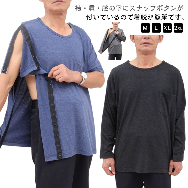 | 袖・肩・脇の下にスナップボタンが付いているので着脱が簡単です。 オープンタイプなので体の不自由な方にも着せやすく常に体を清潔に保つための脱着に最適です♪ フルオープンタイプなので点滴時や手術後の浮腫などの場合にもお着替えラクラク!! 通気性に優れ、汗の吸収もよく肌は常にサラサラに保てます。 開閉が可能なボタン仕様で、着替えが楽です。 療養中の方、お年寄りの方に優しい着心地を提供します。 見た目もオシャレでお部屋着にも最適なデザインです。 普段の着用はもちろん、入院中の寝巻としてもおすすめ。 | |