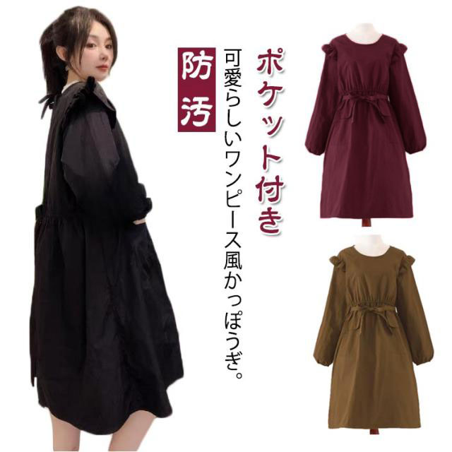 | 可愛らしいワンピース風かっぽうぎ。 撥水加工を施すことで、 生地が濡れにくい。肩フリルで華やかに、機能性でしっかり守る。 韓国風デザインの肩フリル×ワンピース型シルエットで大人可愛い。 撥水・防汚加工で汚れや水はねも安心。 袖はゴムタイプになって、フロントには2つの収納ポケットがあり、小物の収納にも便利! ウェストリボンが後ろに結んでも前に結んでもよい。リボンを結ぶ位置でも雰囲気が変わって楽しめる。 お料理・ガーデニング・DIY・作業・料理教室・陶芸・絵画絵画など、仕事現場のユニフォームに最適。 | |
