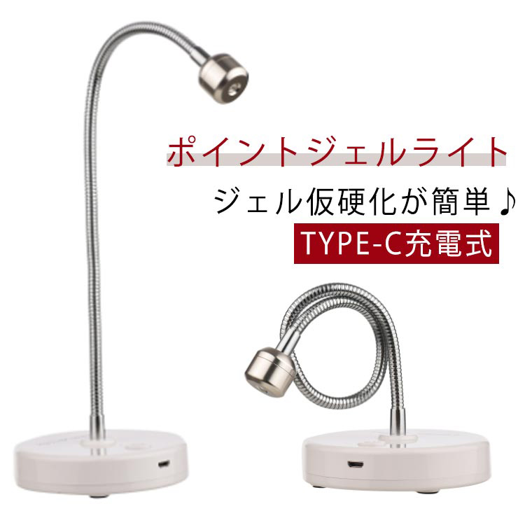 | ポイントジェルライト ジェル仮硬化が簡単♪ 硬化したいポイントに照射できる! 手をライトに入れてもらったり、片手にライトを持ったりしなくても、ライトを当てたいポイントで照射できます。 パーツや手書きアートの仮止め、長さ出しする際にピンチを入れながらの硬化にも最適。 充電式のため、どこへでも持ち運んで使用が可能です。 360°自由自在に角度調節可能。 | |