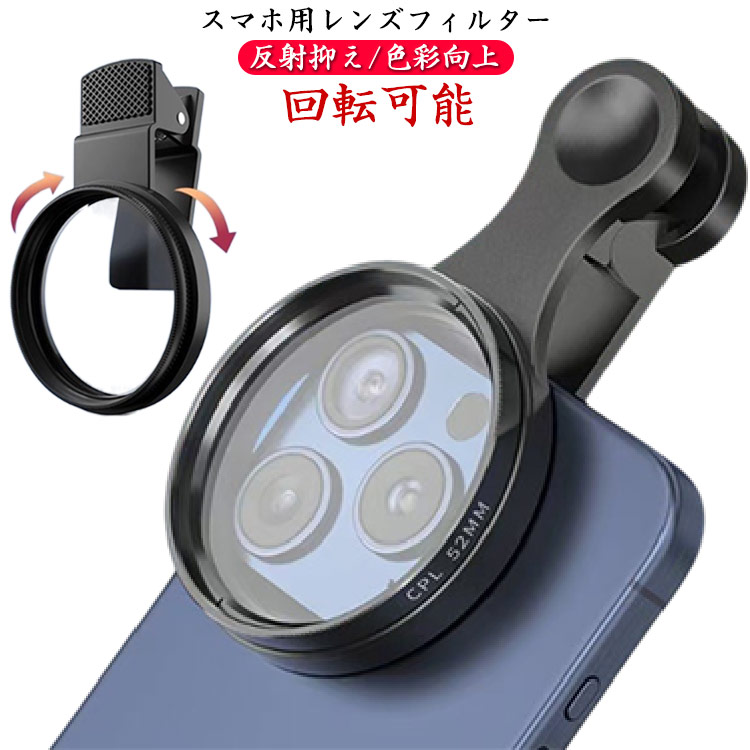 | スマホ用レンズフィルター 反射抑え/色彩向上 回転可能 春夏秋冬、風景写真に欠かせないCPLレンズフィルターです。 不要な反射光を取り除くことで、被写体の色彩を鮮やかに写し出します。青空を濃くし、清流や海をクリアに、新緑や紅葉の鮮やかな色彩をそのまま再現します。 回転式のフィルター枠に入っており、前側の枠を少しずつ回転させることで、反射の取れ具合をコントロールできます。 クリップ式レンズでスマホにかさむだけで簡単に取り付けられます。 52mmのフィルターサイズに対応しており、ほとんどのスマートフォンで使用可能です。 付属のスマホ用グリップは、持ちやすく安定感を提供し、撮影時のブレを軽減します。快適な撮影体験をサポートします。 電車の窓からの風景やアウトドア撮影など、さまざまなシーンで活躍し、プロフェッショナルな仕上がりを実現します。 | |