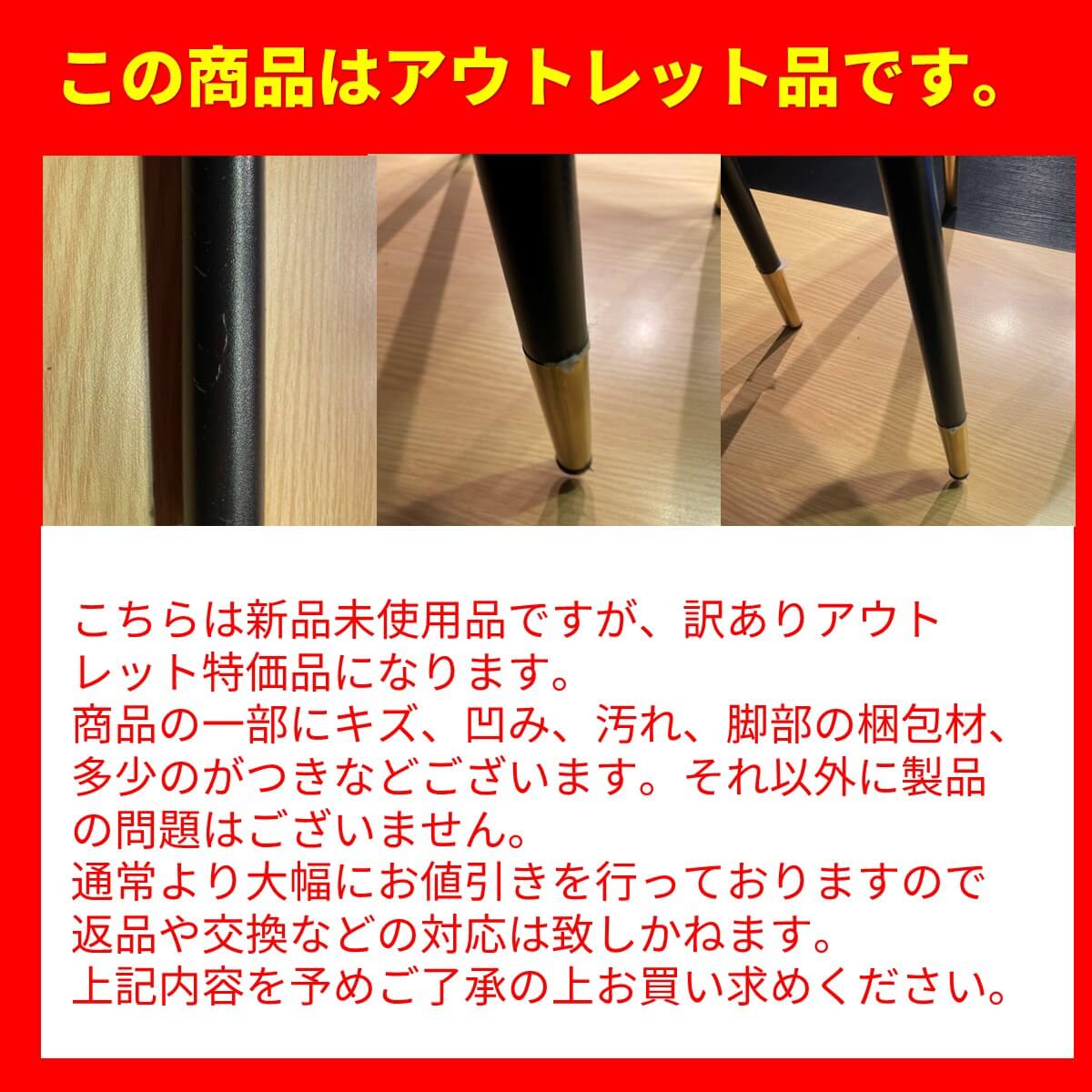こちらは新品未使用品ですが、訳ありアウトレット特価品になります。商品の一部にキズ、凹み、汚れ、脚部の梱包材、多少のがつきなどございます。それ以外に製品の問題はございません。通常より大幅にお値引きを行っておりますので返品や交換などの対応は致しかねます。上記内容を予めご了承の上お買い求めください。