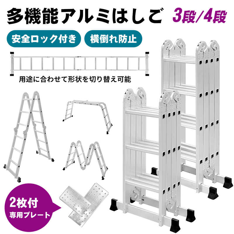【多機能・変形自在の設計】1台で「はしご」「脚立」「作業台」として使えるはしご兼用脚立です。多関節ロック構造により角度調整が可能で、作業内容に応じた形態にスムーズに変更できます。付属の専用プレートを取り付ければ、簡易作業台としても使用可能です。