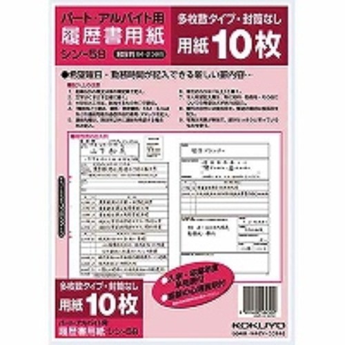 コクヨ 履歴書用紙 多枚数 B5(B4・2つ折り) パート・アルバイト用 10枚 シン-58/メール便送料無料