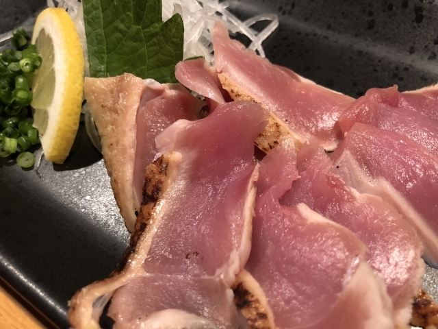 鶏たたき !心地よい歯ごたえの鶏モモ炙りタタキはもも肉の旨みがひろがるおいしさです。