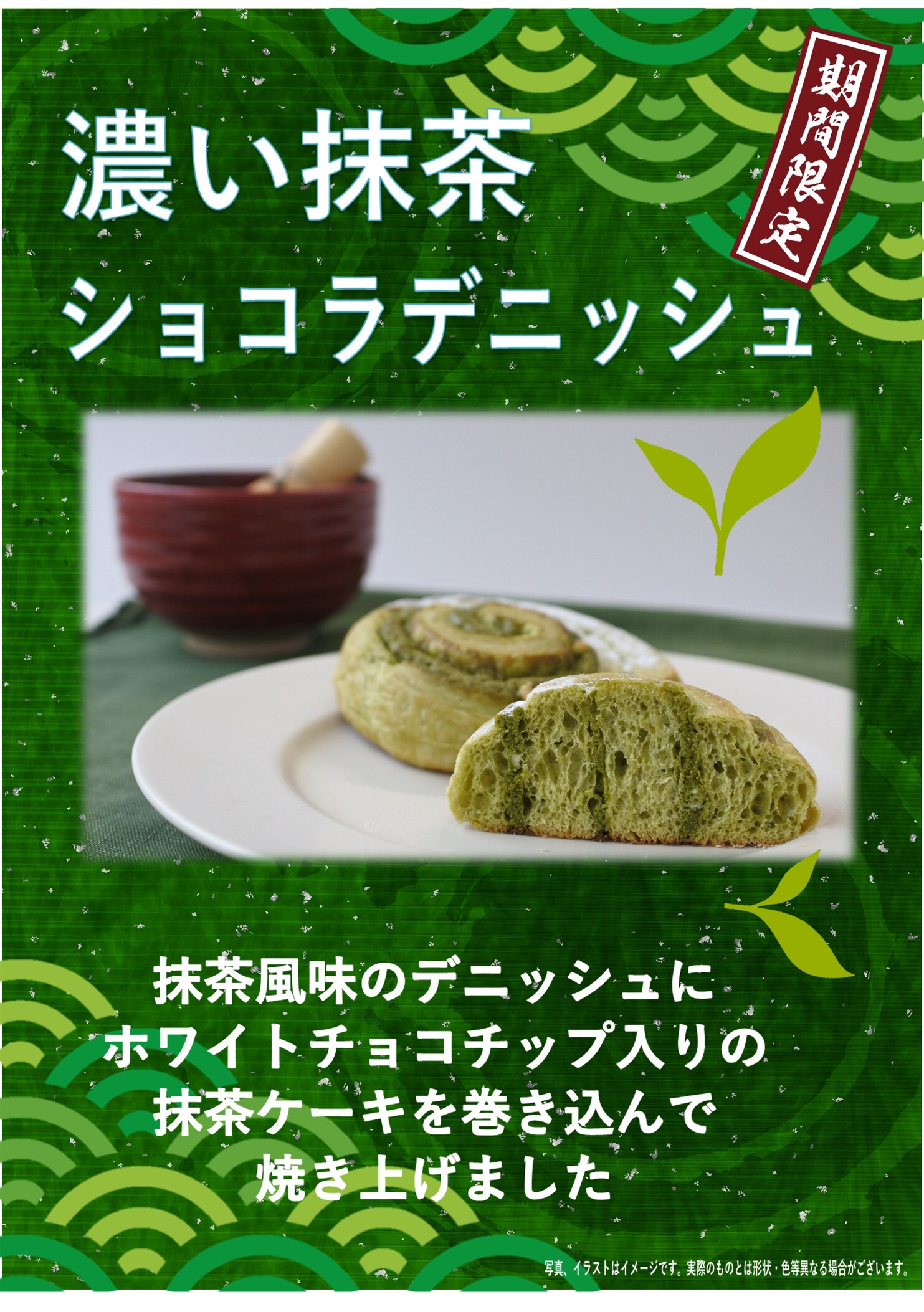 ■コメント淡い緑色の抹茶風味のデニッシュ生地に、ホワイトチョコチップ入りの濃い緑色の抹茶ケーキ生地を巻き込んだ商品です。