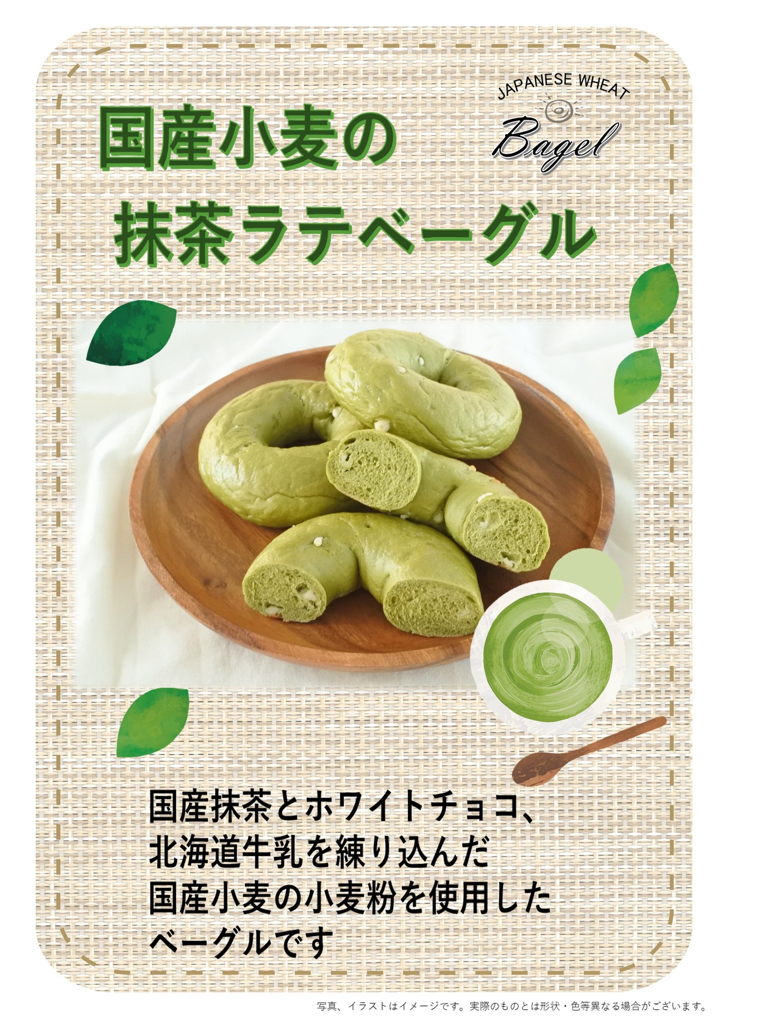 ■コメント国産抹茶とホワイトチョコ、北海道牛乳を練り込んだ国産小麦の小麦粉を使用したベーグルです。