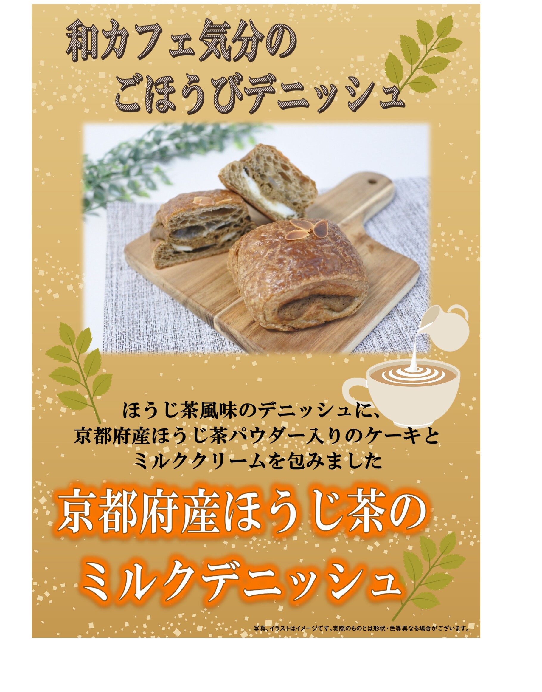 ■コメント ほうじ茶風味のデニッシュ生地に、京都府産ほうじ茶パウダー入りのケーキ生地とミルククリームを包みました。