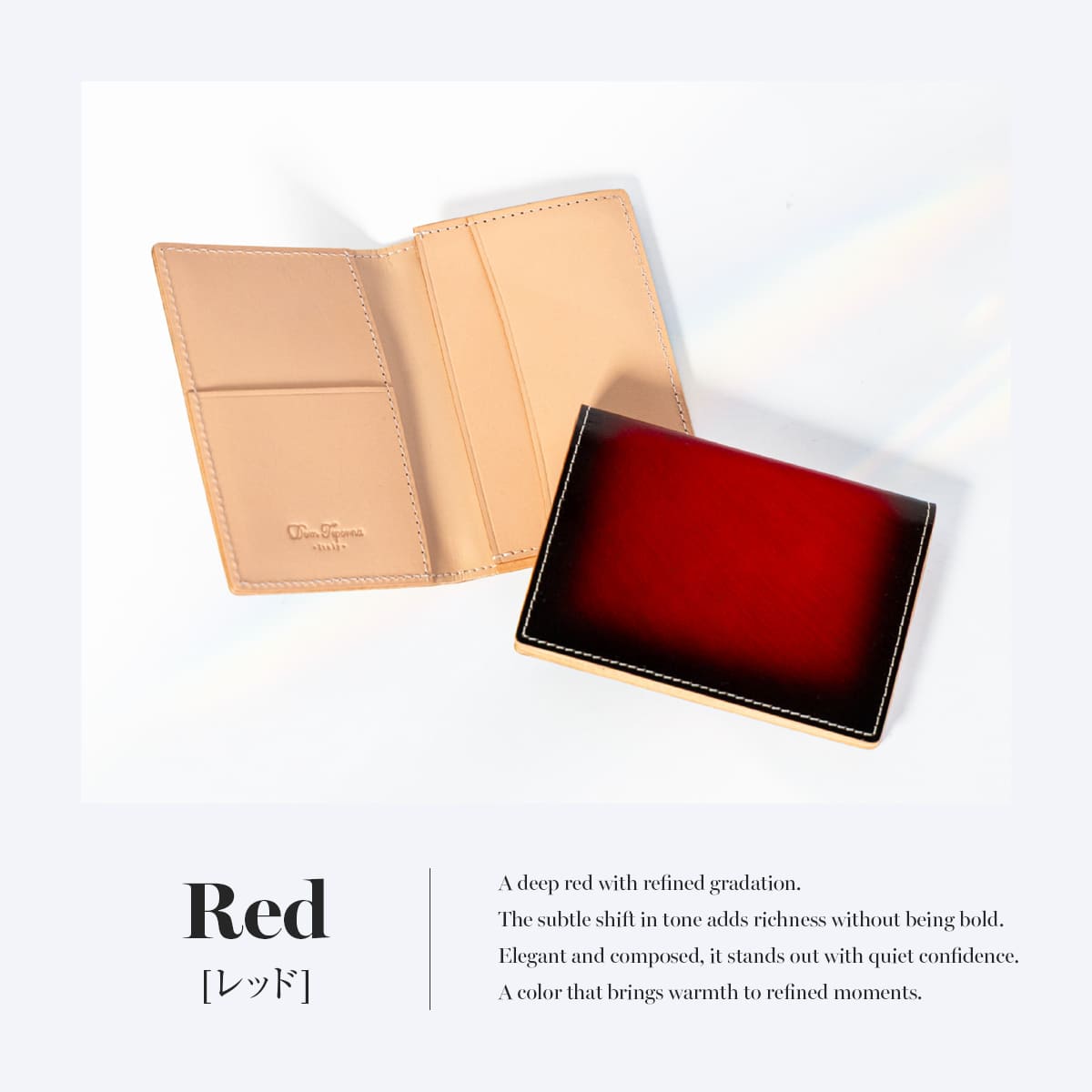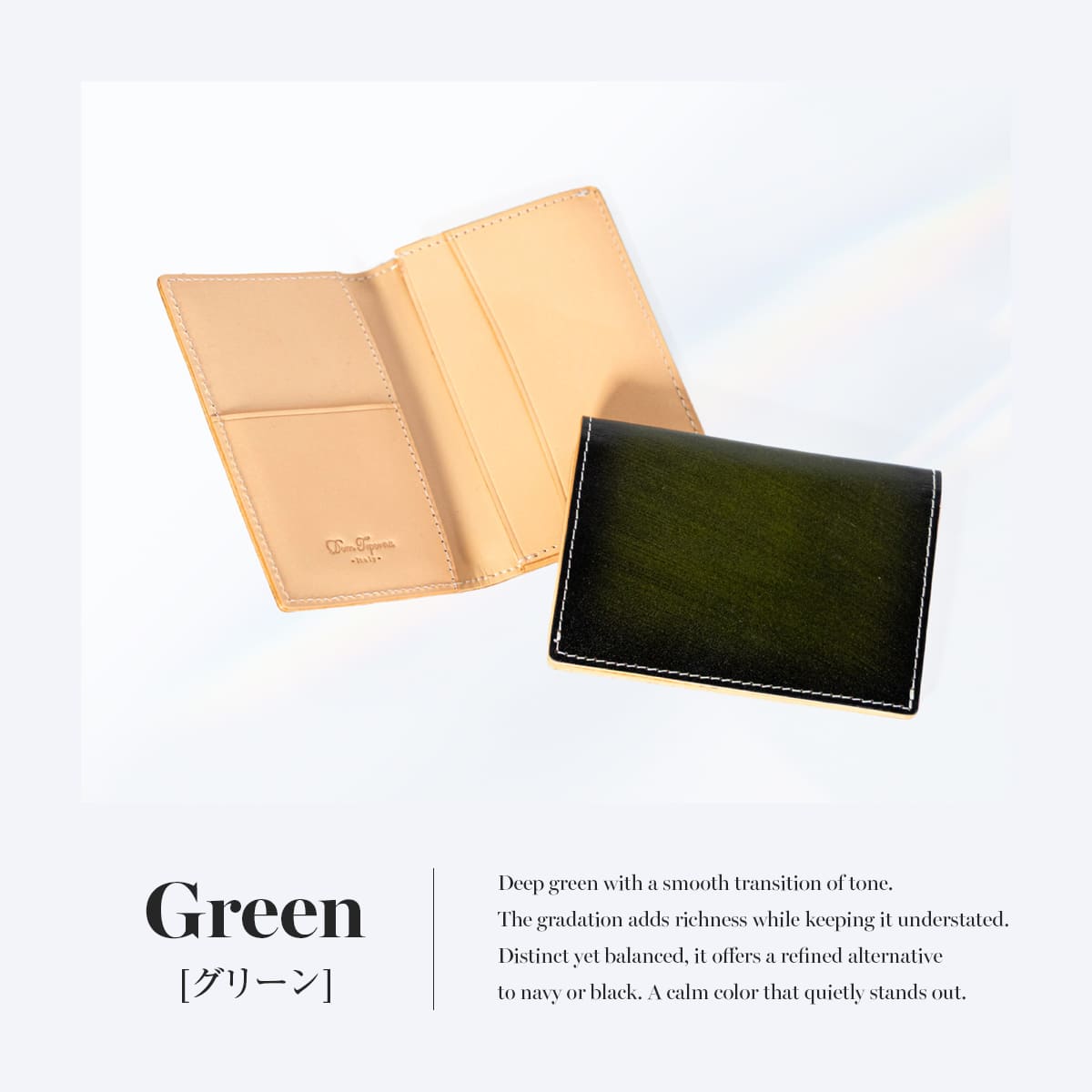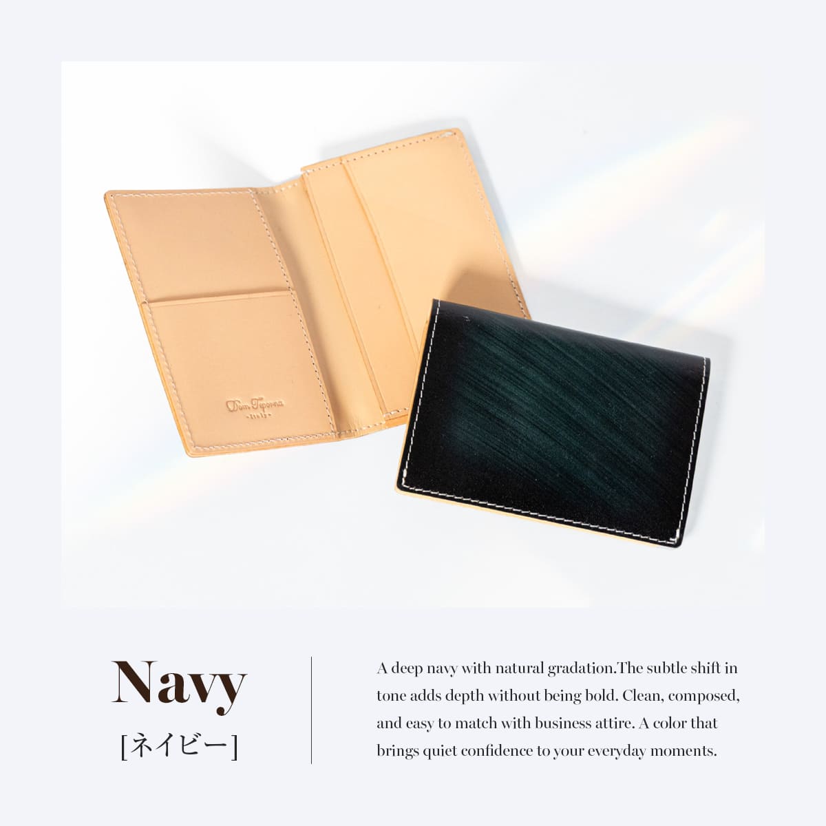 上質な本革イタリアンレザーを使用したDomTeporna Italyの名刺入れ。ビジネスシーンで使いやすい薄型コンパクト設計のカードケースです。メインポケットには名刺をまとめて収納でき、上段ポケットには交換した名刺を分けて整理できるなど、スマートな使い心地。標準的な厚さの名刺であれば約10〜15枚収納可能。メンズ・レディース問わず使えるシンプルなデザインで、就職祝いや昇進祝いなどのビジネスギフトにもおすすめです。
