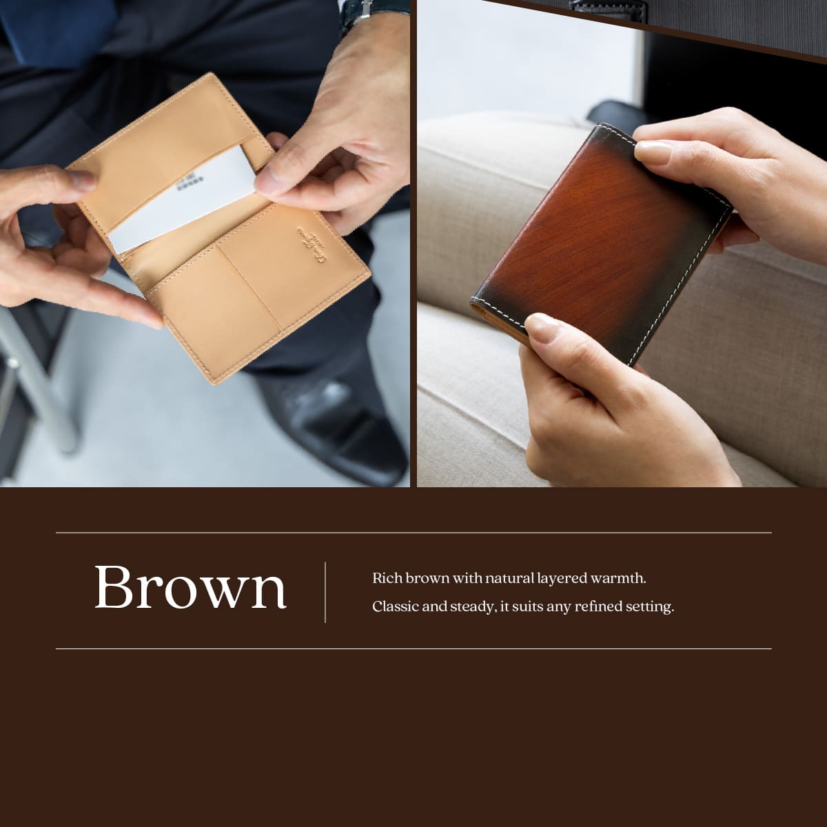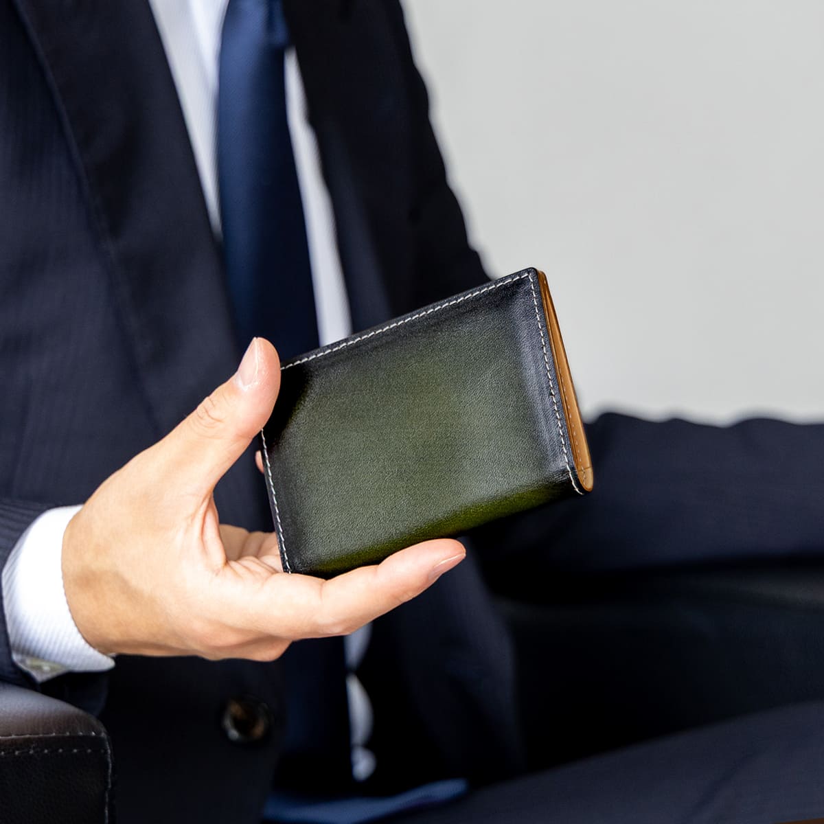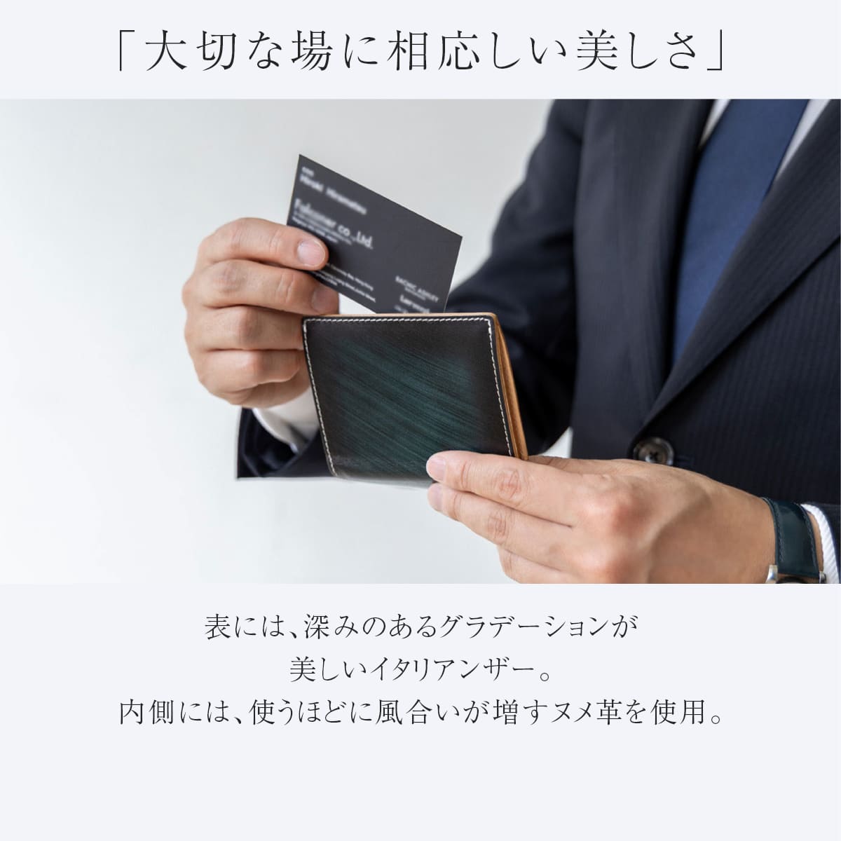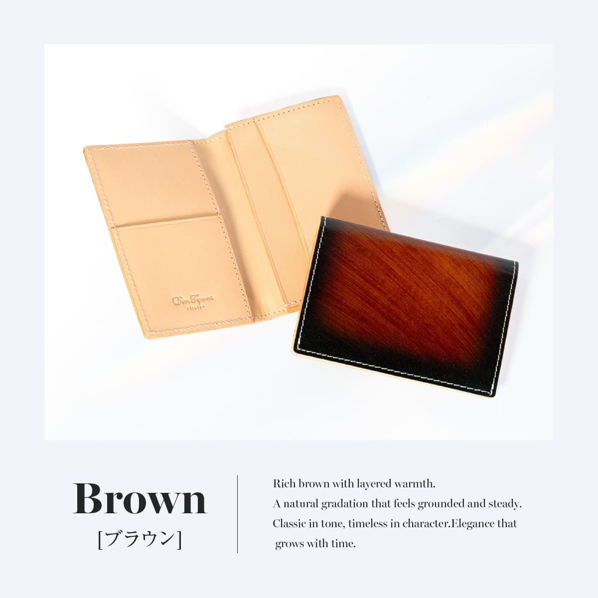 上質な本革イタリアンレザーを使用したDomTeporna Italyの名刺入れ。ビジネスシーンで使いやすい薄型コンパクト設計のカードケースです。メインポケットには名刺をまとめて収納でき、上段ポケットには交換した名刺を分けて整理できるなど、スマートな使い心地。標準的な厚さの名刺であれば約10〜15枚収納可能。メンズ・レディース問わず使えるシンプルなデザインで、就職祝いや昇進祝いなどのビジネスギフトにもおすすめです。