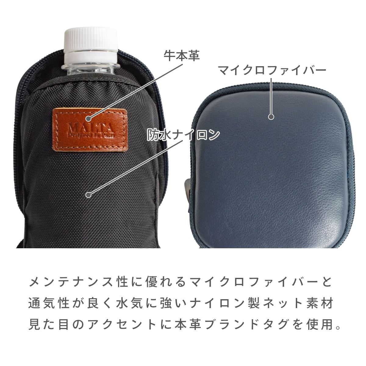 メンテナンス性に優れるマイクロファイバーと、通気性が良く水気に強いナイロン製ネット素材。見た目のアクセントに本革製のブランドタグを使用。
