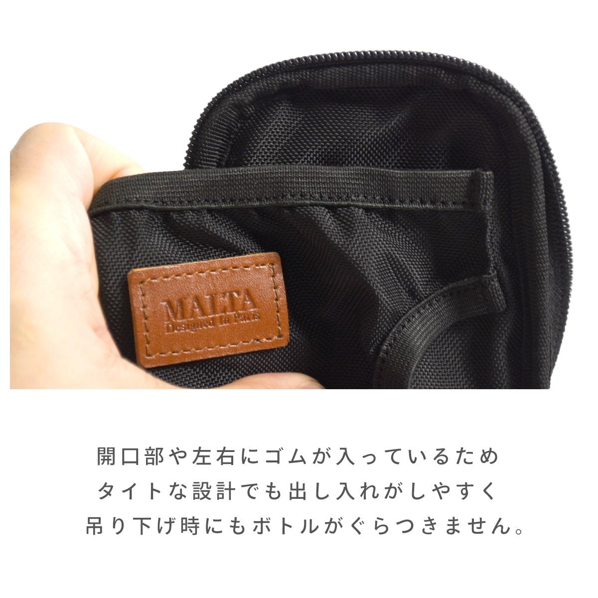 開口部や左右にゴムが入っているため、タイトな設計でも出し入れがしやすく、吊り下げ時にもボトルがぐらつきません。