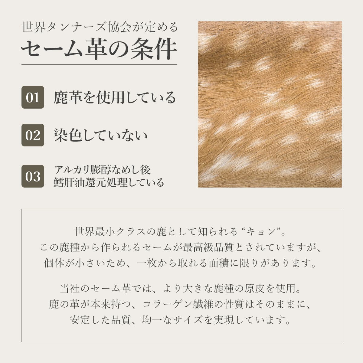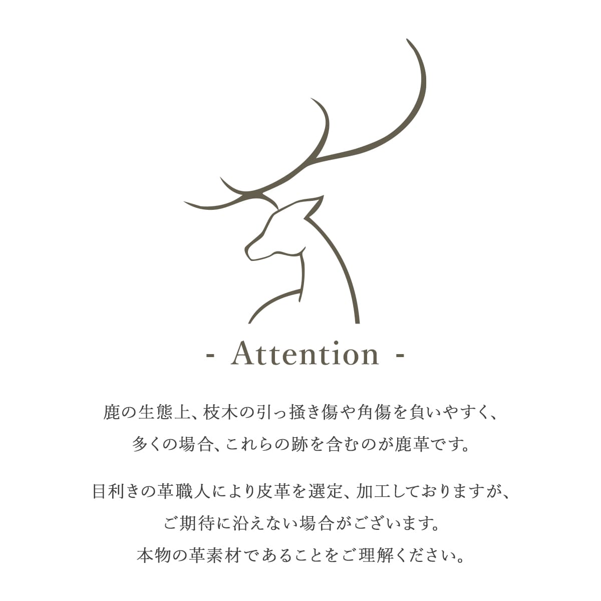 ※鹿は生態上、枝木の引っ掻き傷や角傷を負いやすく、鹿革にもそれらの痕が残ります。本製品にも傷や皺の痕、革の部位による若干の厚みの差がみられることがあります。本物の革の証としてご了承くださいませ。