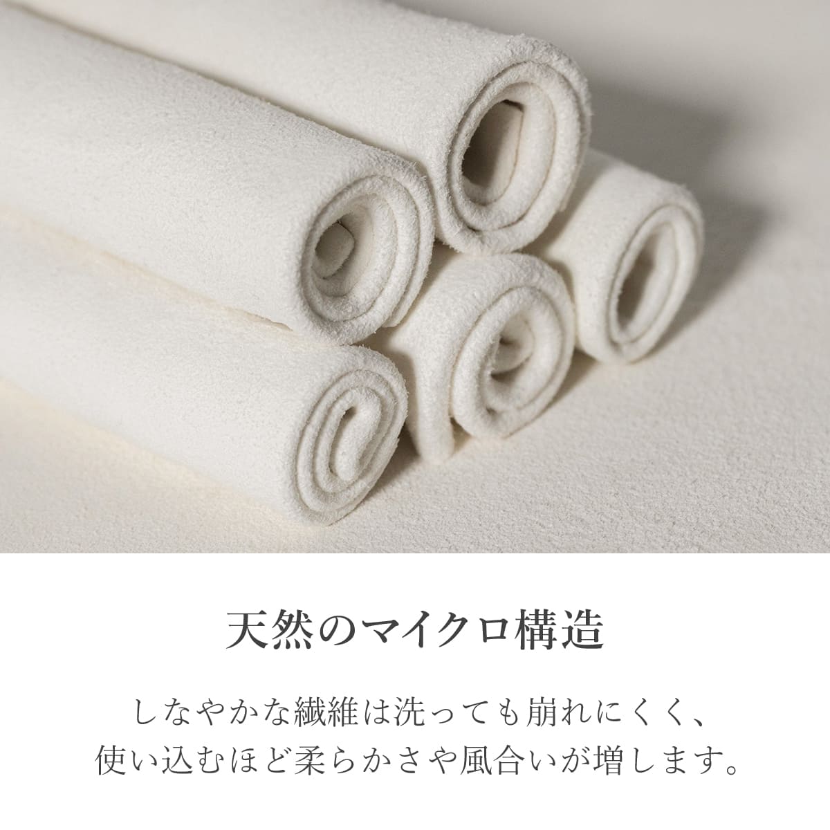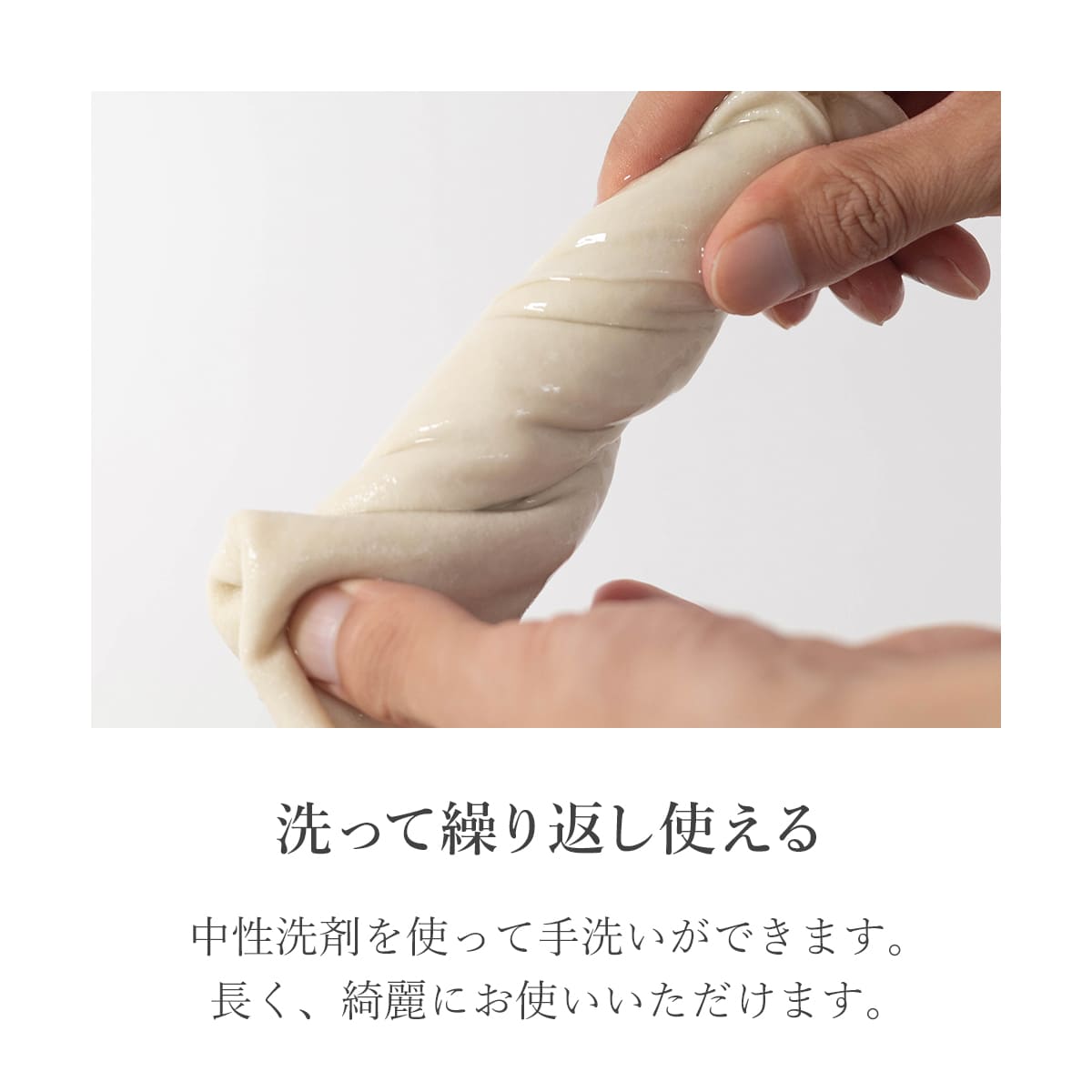汚れた場合は中性洗剤で手洗いが可能です(洗濯機は使用できません)。水かぬるま湯ですすいで優しくしぼり、風通しのよいところで陰干ししてください。8割ほど乾いた状態で全体を揉むと柔らかさが長持ちします。