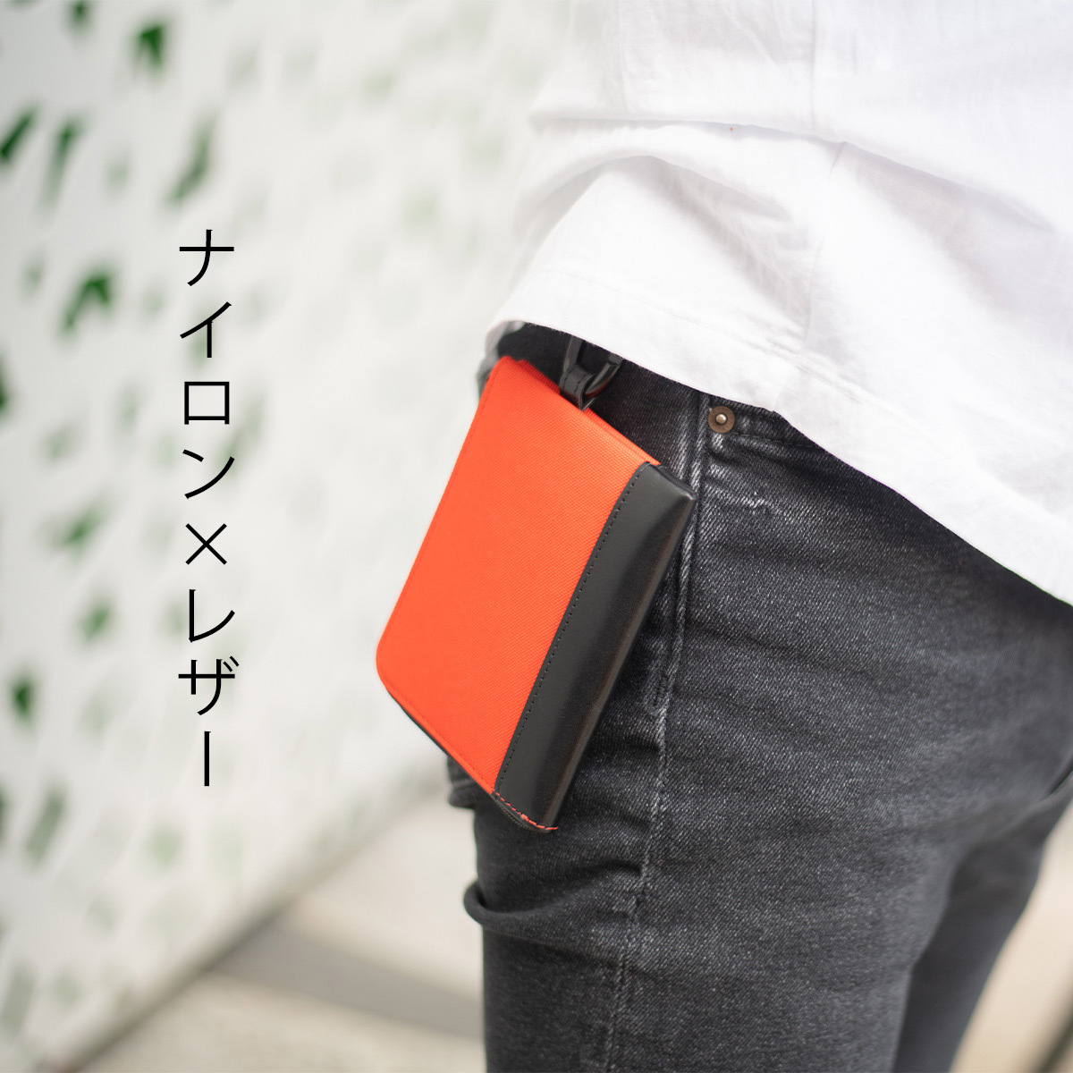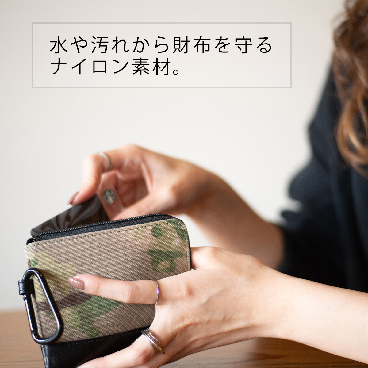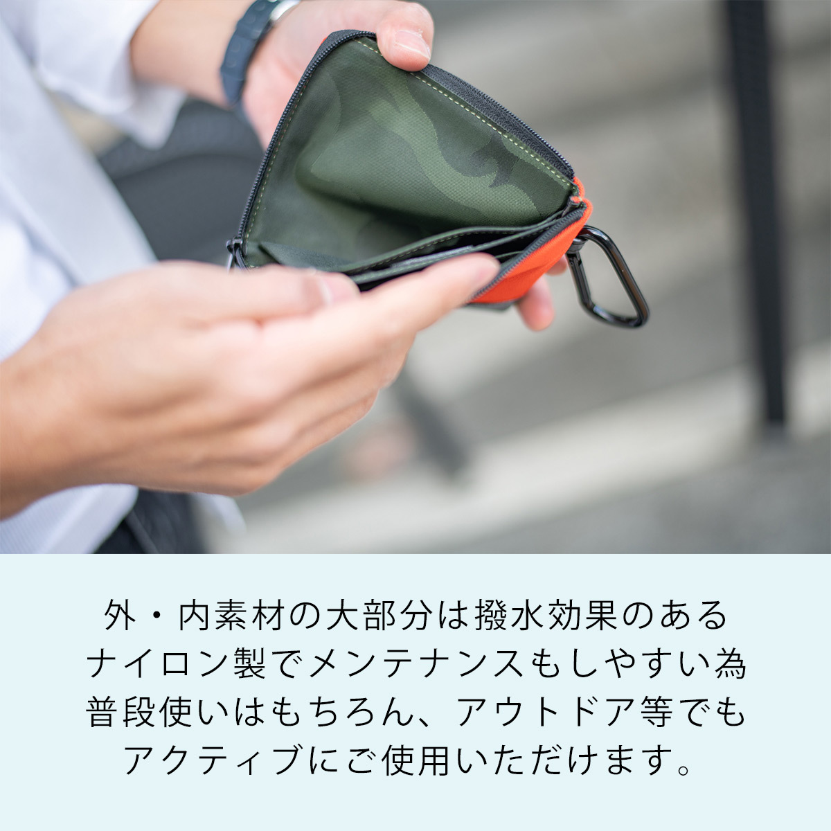 水や汚れから財布を守るナイロン素材。