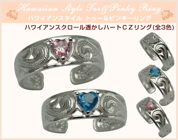 ハワイアンジュエリー リング ピンキーリング トゥリング ハワイアンスクロール透かしハートCZリング 全3色 フリーサイズ 送料無料!