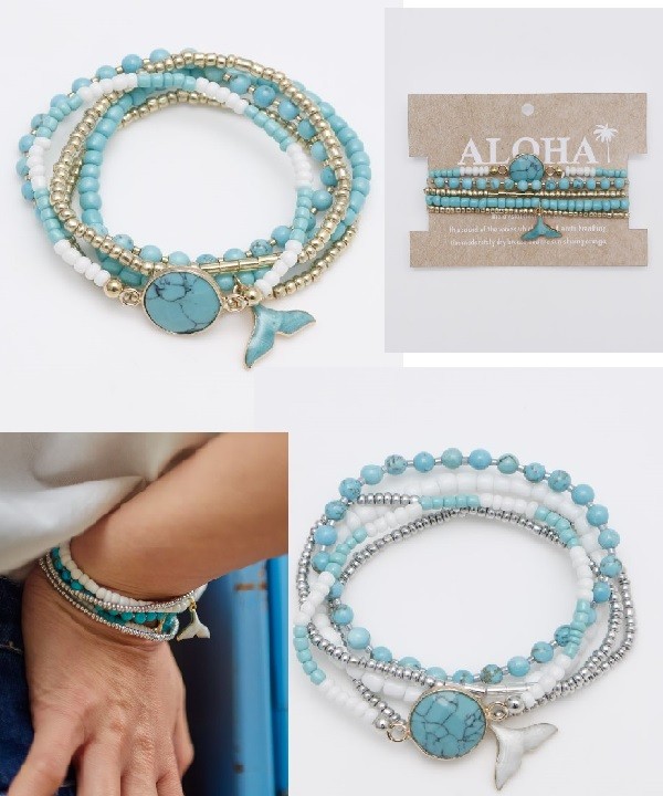 ホエールテールのチャームがついたターコイズのセットブレスレット。