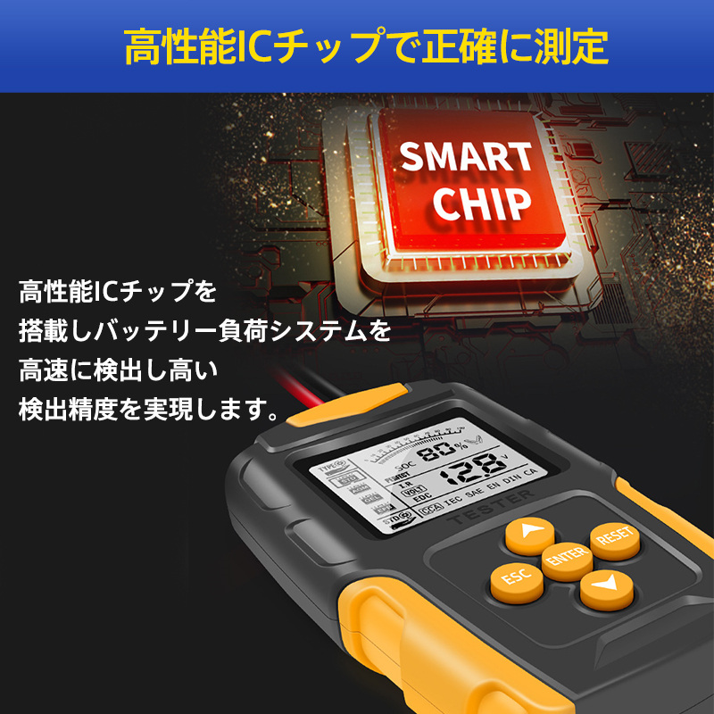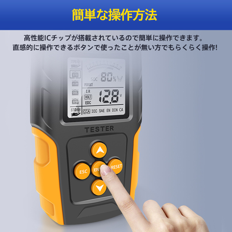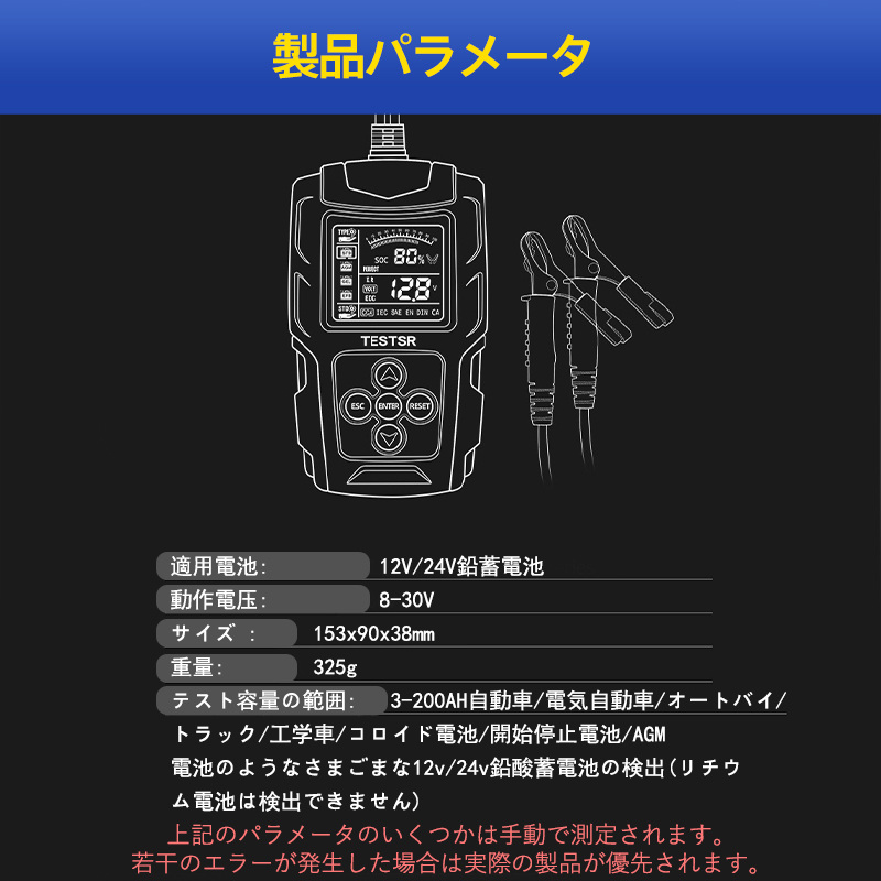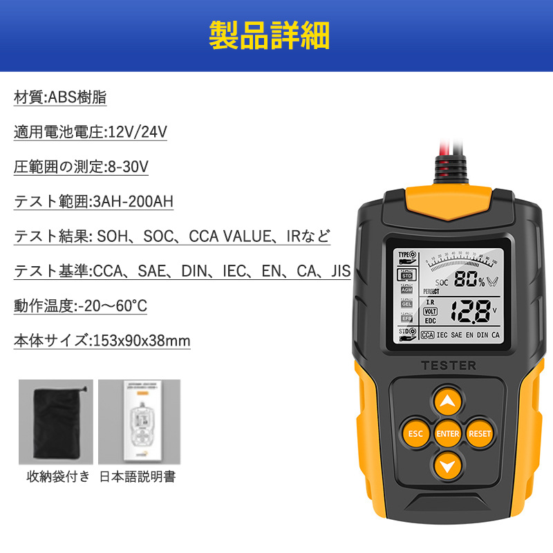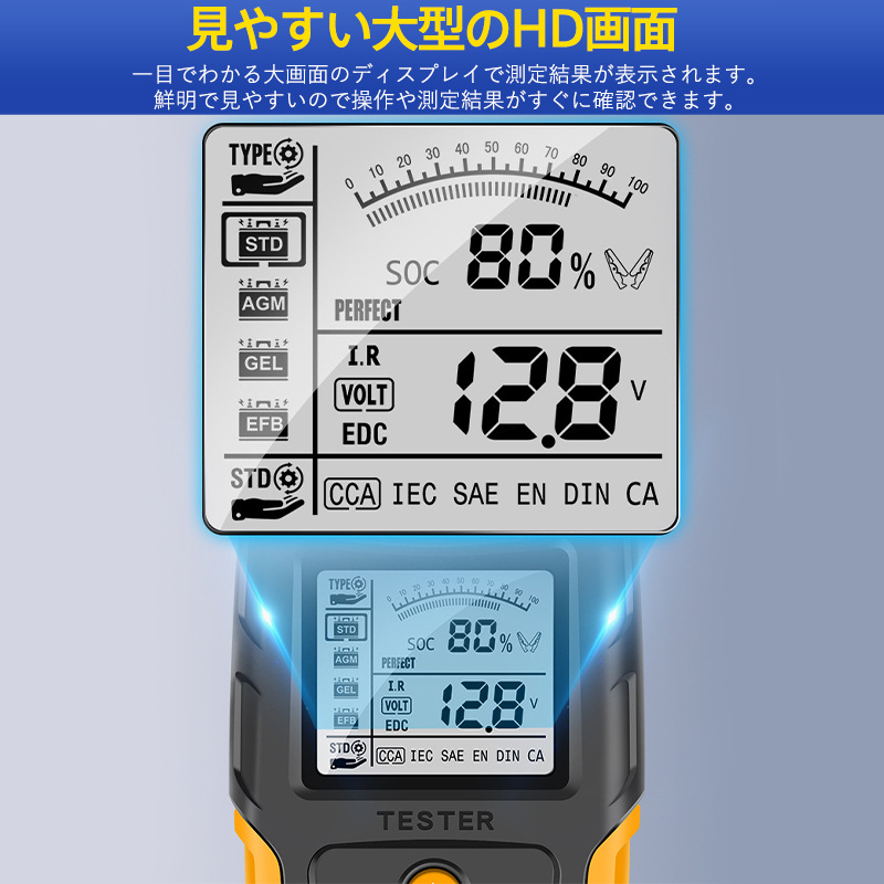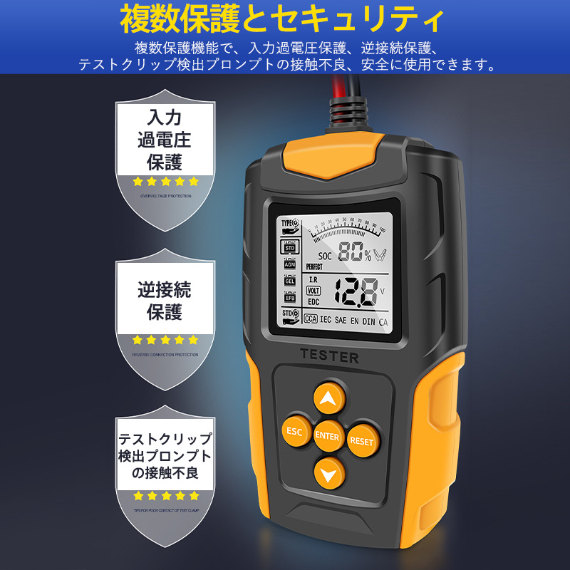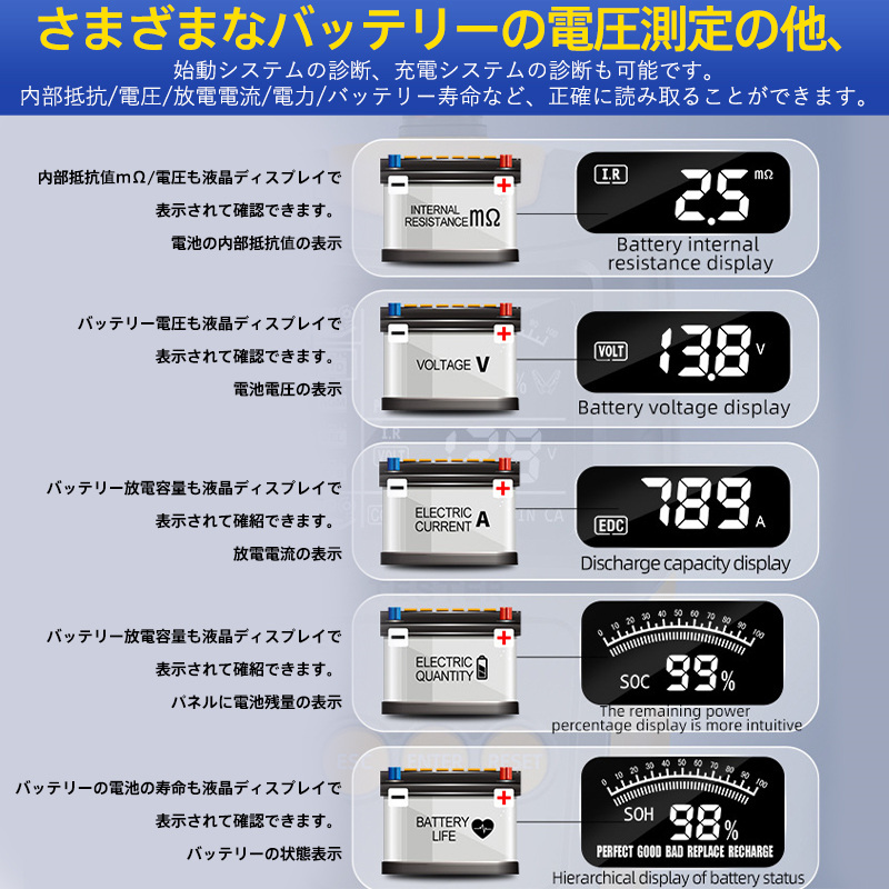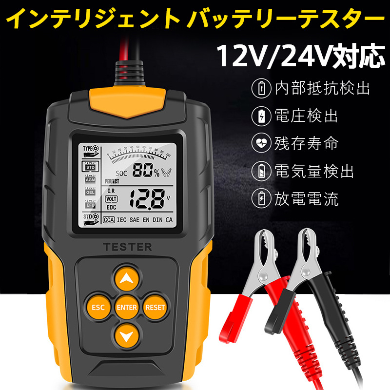 即納 カーバッテリーテスター 自動車バッテリーチェッカー バッテリー診断機 電圧テスタ 抵抗 CCA値測定 LCD液晶画面 12V/24V 品質保証