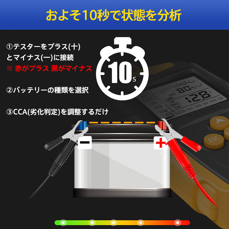 10秒で結果が出る即時診断機能を備え、テスターをバッテリーのプラス(+)とマイナス(?)に接続するだけで、タイプと劣化状態を簡単に設定できます。