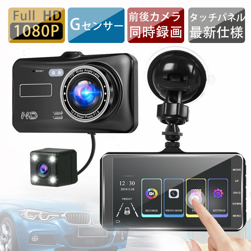 ドライブレコーダー タッチパネル バックカメラ付き 前後 2カメラ 録画 駐車監視 4インチ IPS液晶 フルHD 高画質 1080P 広角170度
