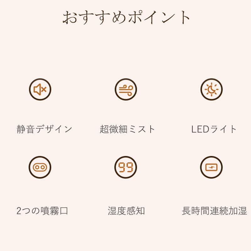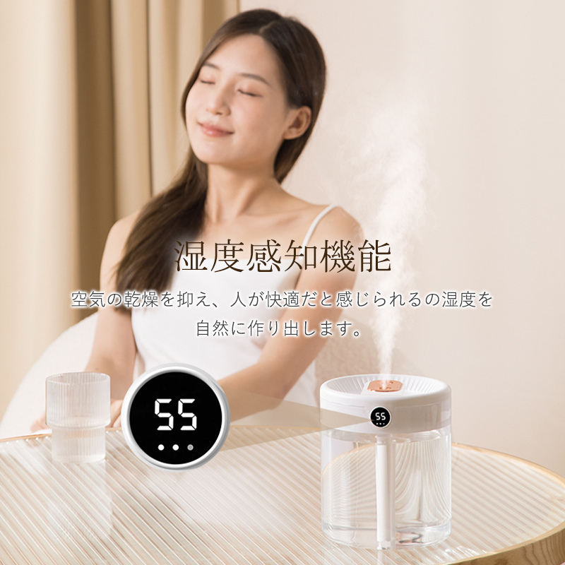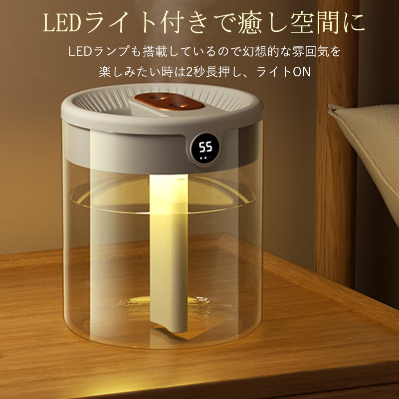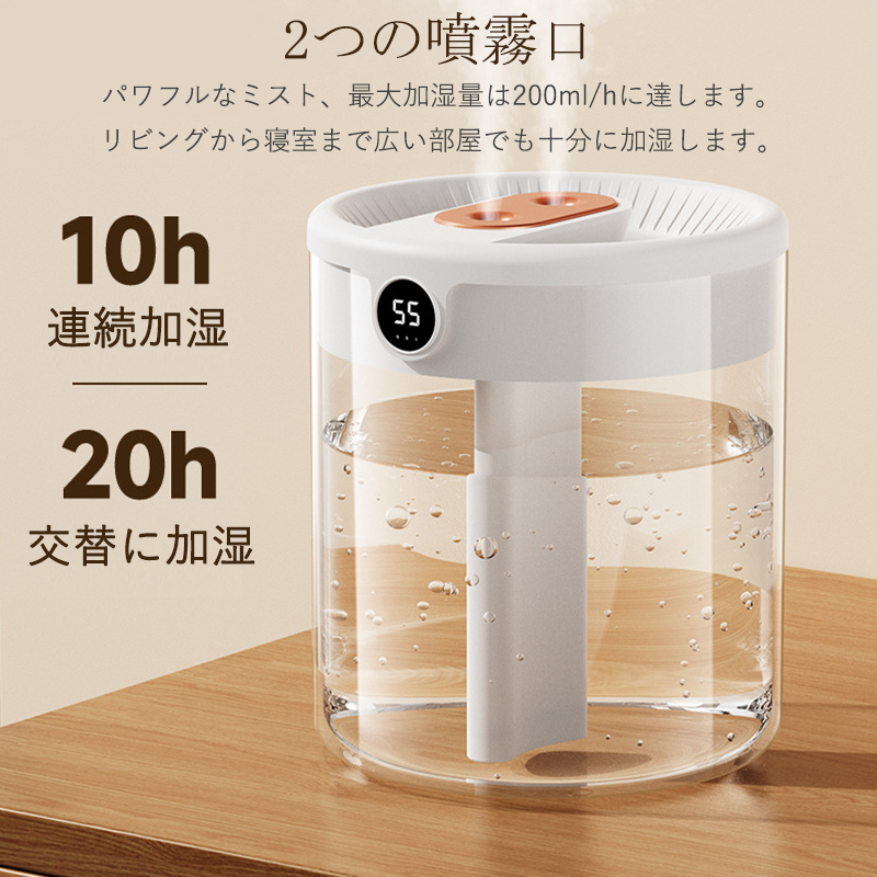 ダブル吹き出し口を採用し、2つの噴霧口でパワフルに加湿でき、霧化効果は従来の卓上加湿器の約2倍になり。