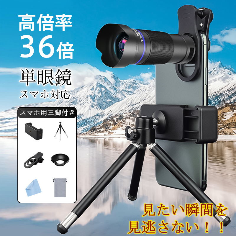 単眼鏡 望遠鏡 高倍率 36倍 スマホカメラレンズ スマホ 望遠レンズ クリップ式 コンサート 三脚付属 軽量 簡単装着 小型 観戦 写真撮影 子供