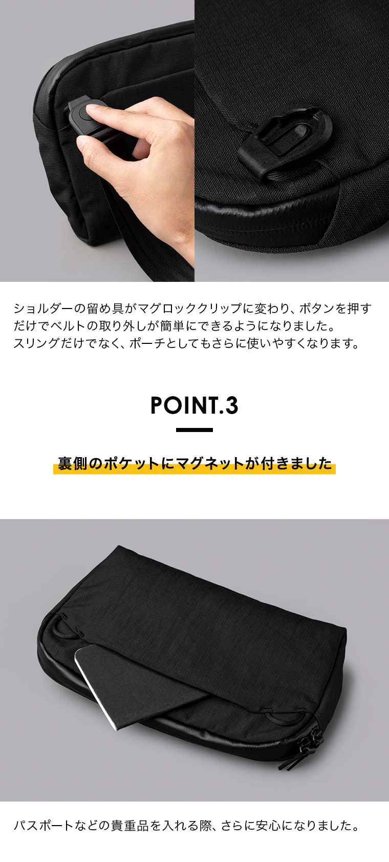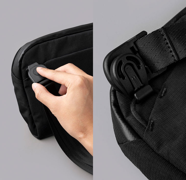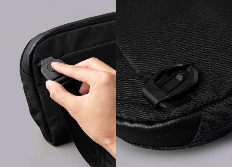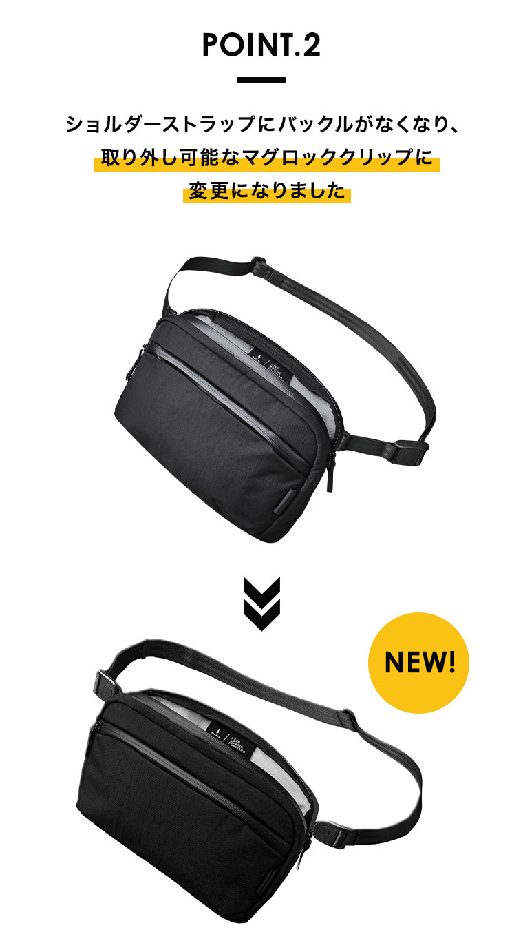 ショルダーの留め具がマグロッククリップに変わり、ボタンを押すだけでベルトの取り外しが簡単にできるようになりました。スリングだけでなく、ポーチとしてもさらに使いやすくなります。