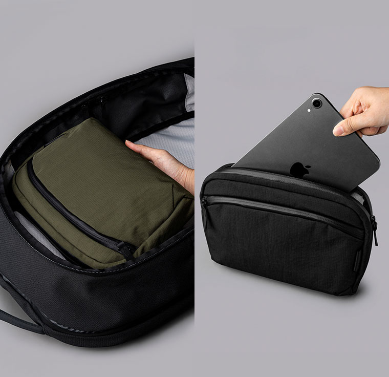 フライトスリングは旅行に持ち運んだり、ストラップを取り外してスタイリッシュなテックポーチとして使用できます。