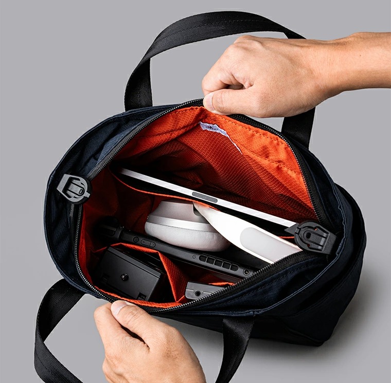 耐久性、耐水性のあるAxoflux素材を使用し、上部ファスナー付きの自立型のミニトートバッグで防犯的にも安心です。