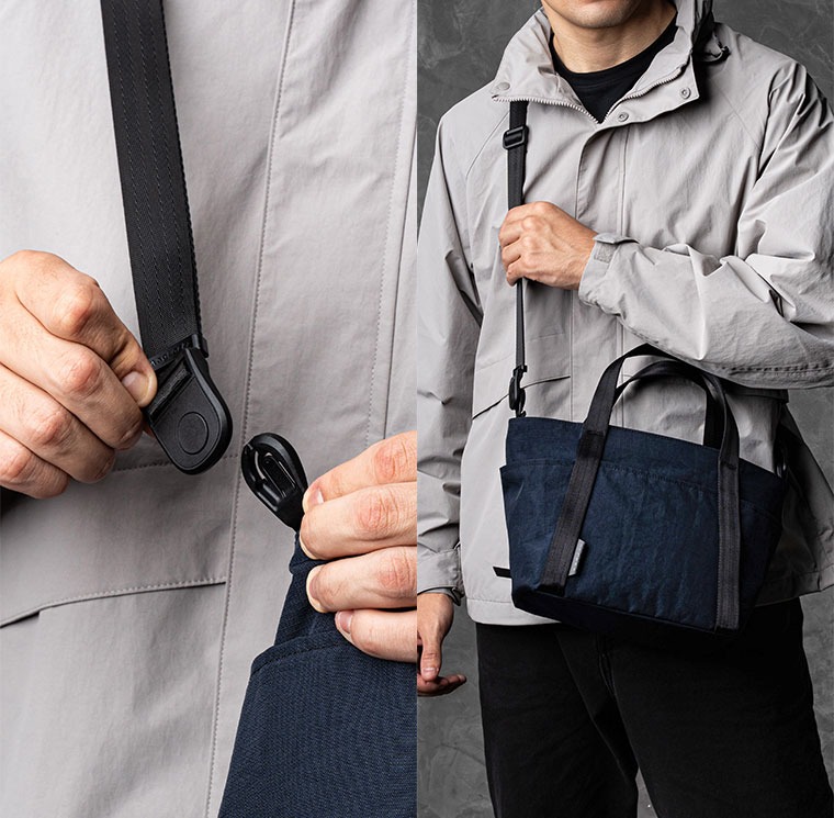 ショルダーストラップは取り外し可能なマグロッククリップ付きで簡単に取り外し出来ます。また、カラビナ(別売)などアクセサリーに対応可能です。