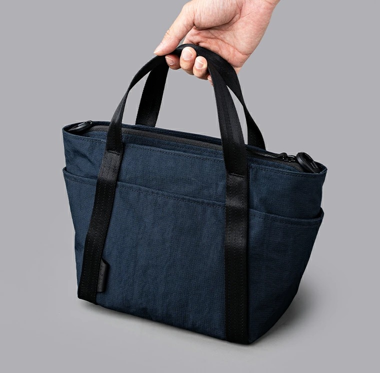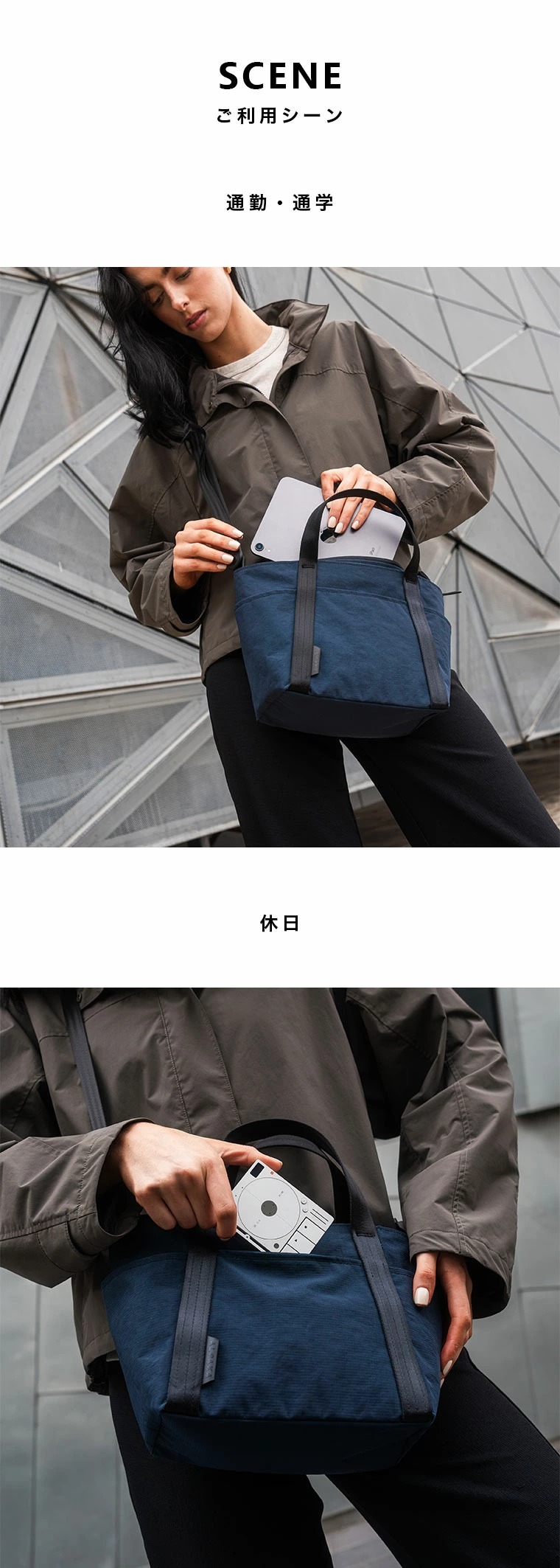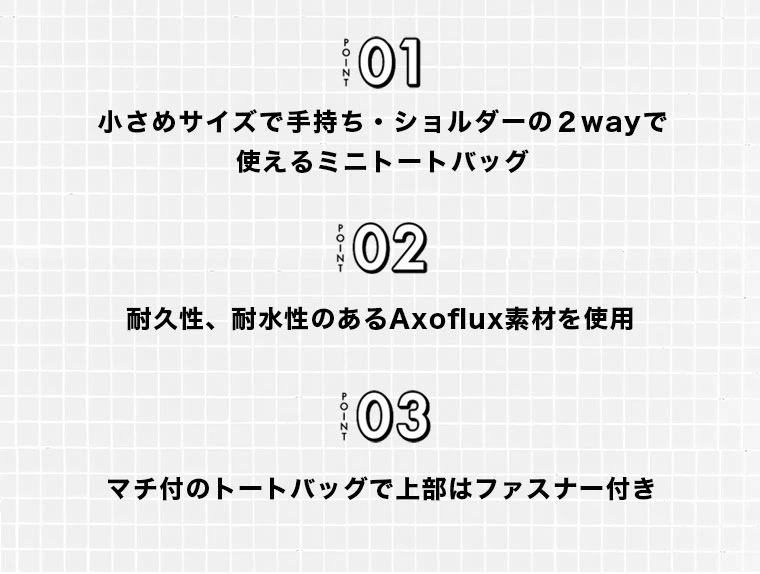 | 小さめサイズで多彩なポケット付きミニトートバッグ。耐久性、耐水性のあるAxoflux素材を使用、女性の方でも合わせやすいミニサイズでショルダー・手持ちの2wayで使用できる、毎日使いやすい日常バッグです。 |