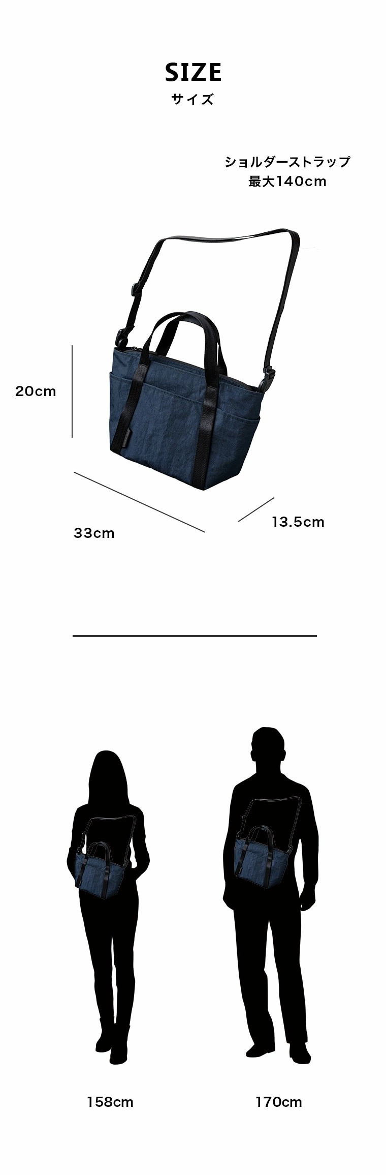 | サイズ(約) | [本体]タテ20cm×ヨコ33cm×マチ13.5cm [ショルダーベルト] 80〜140cm |