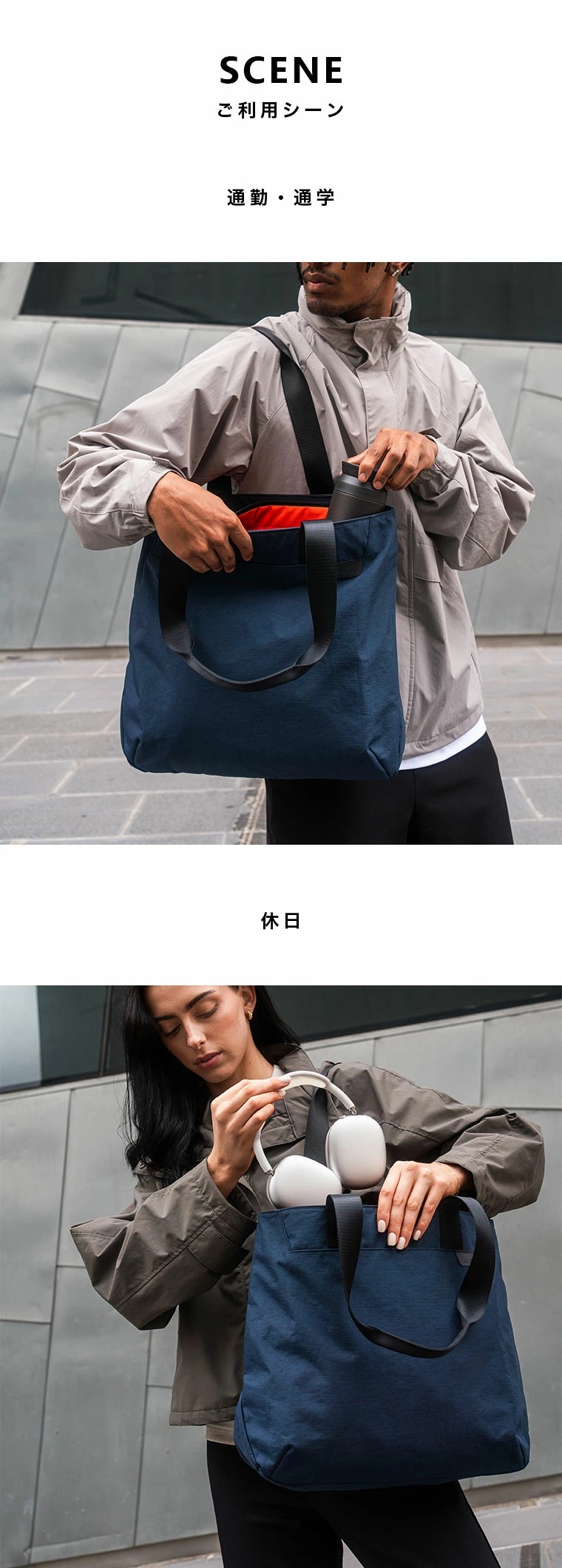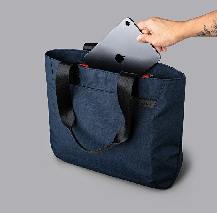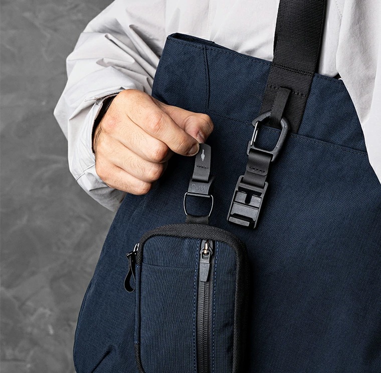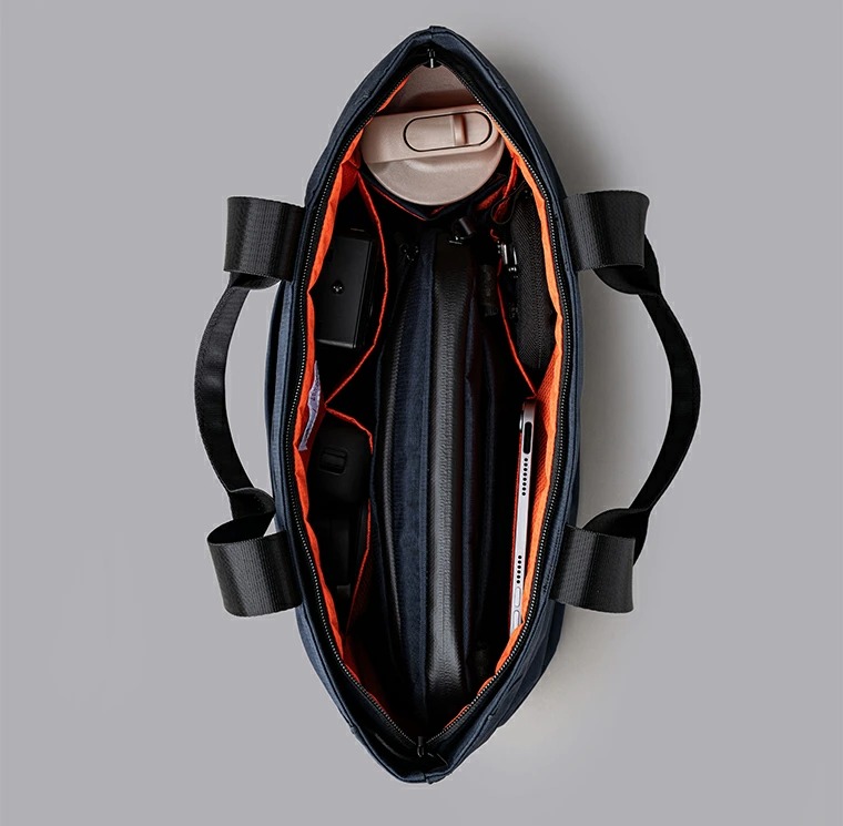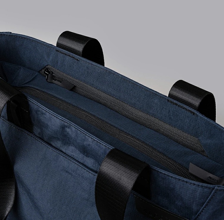 耐久性、耐水性のあるAxoflux素材を使用し、上部ファスナー付きの自立型のトートバッグで防犯的にも安心です。