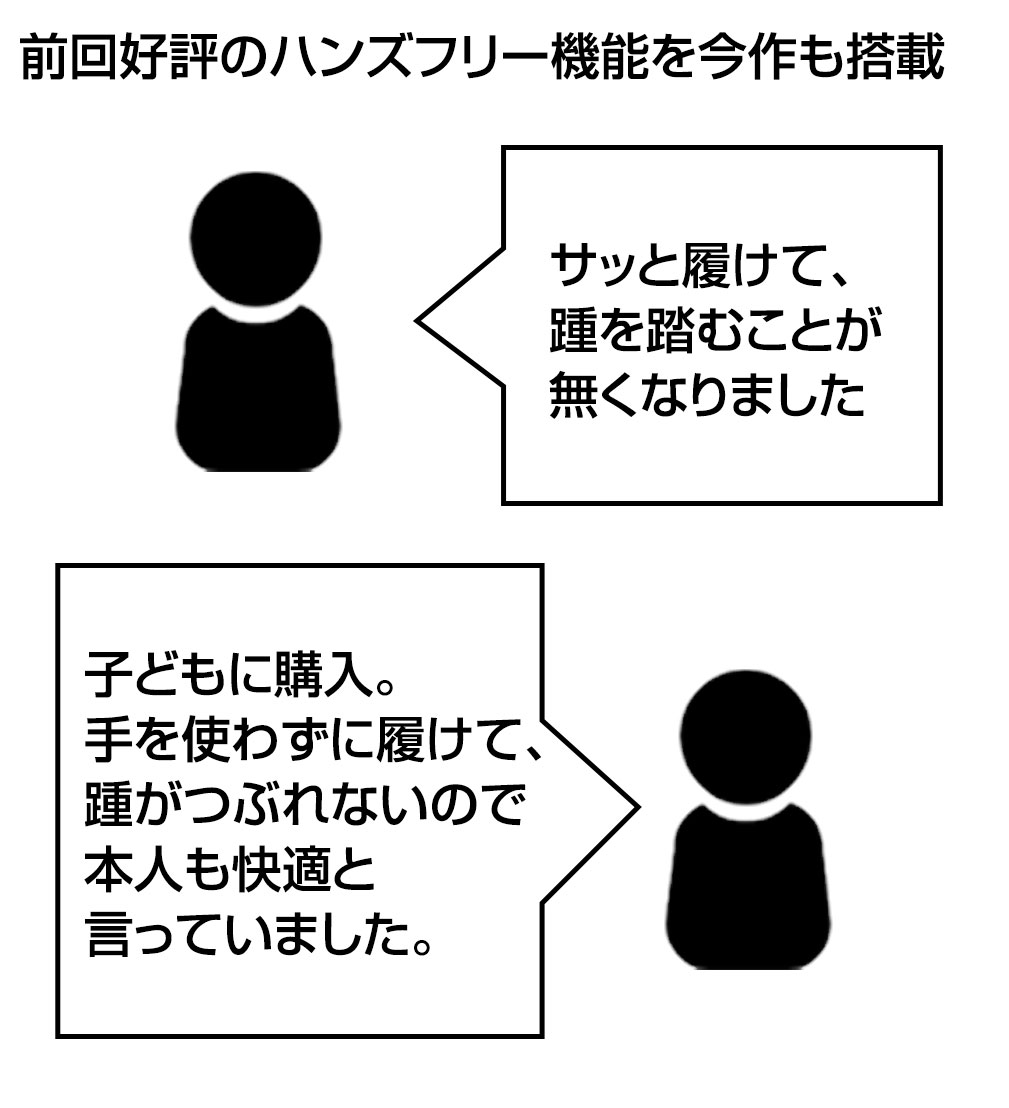◇手を使わず履ける「ハンズフリー機能」。サッと履けるので、慌てて履く事の多いお子様でも踵を踏まずに使用可能。